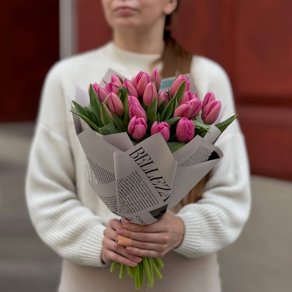 - Як замовити 25 малинових тюльпанів у букеті «Солоденький дарунок»? ❯