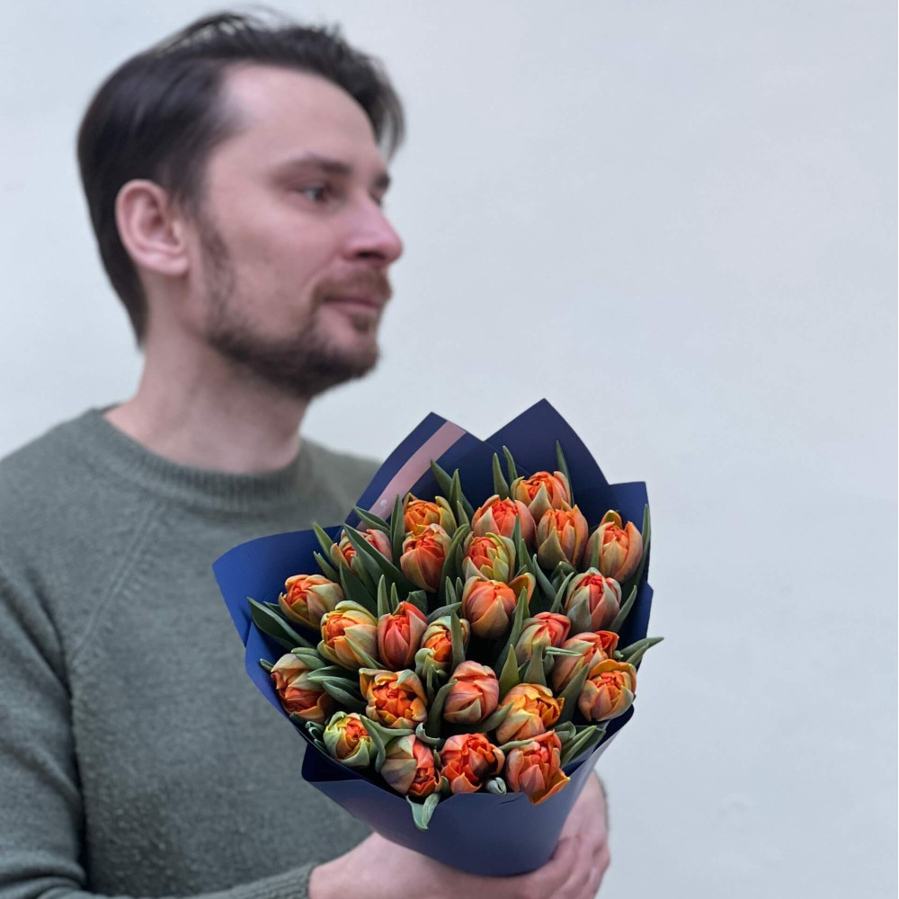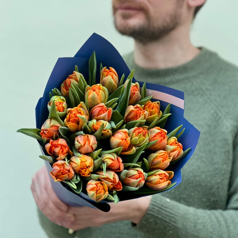 - Як замовити 25 півонієвидних помаранчевих тюльпанів у букеті «Бурштинові камінчики»? ❯