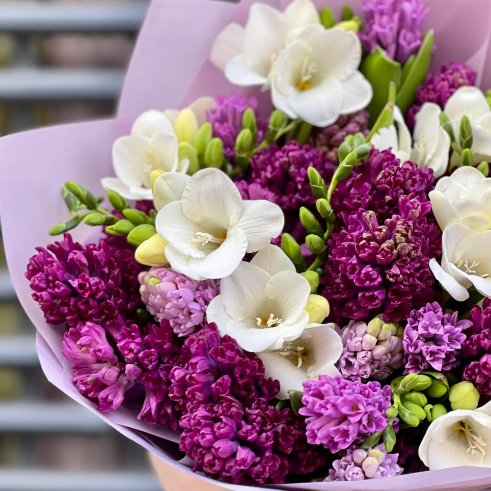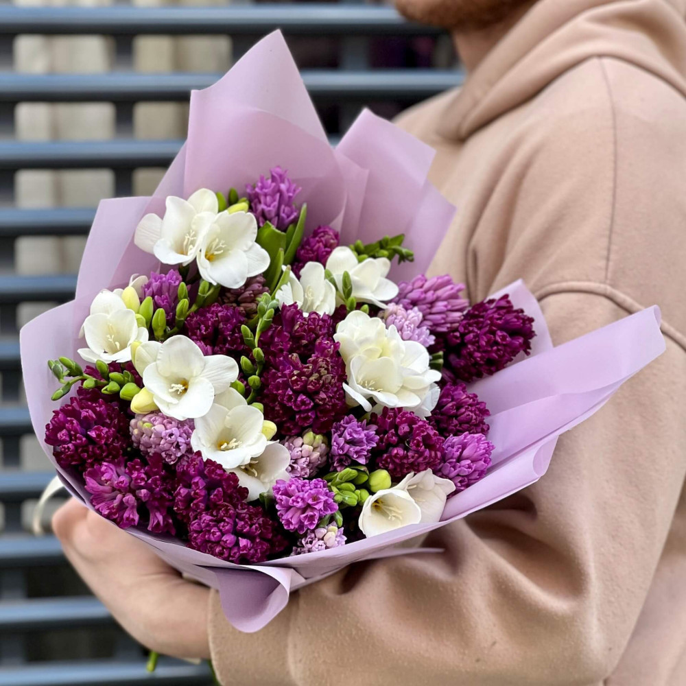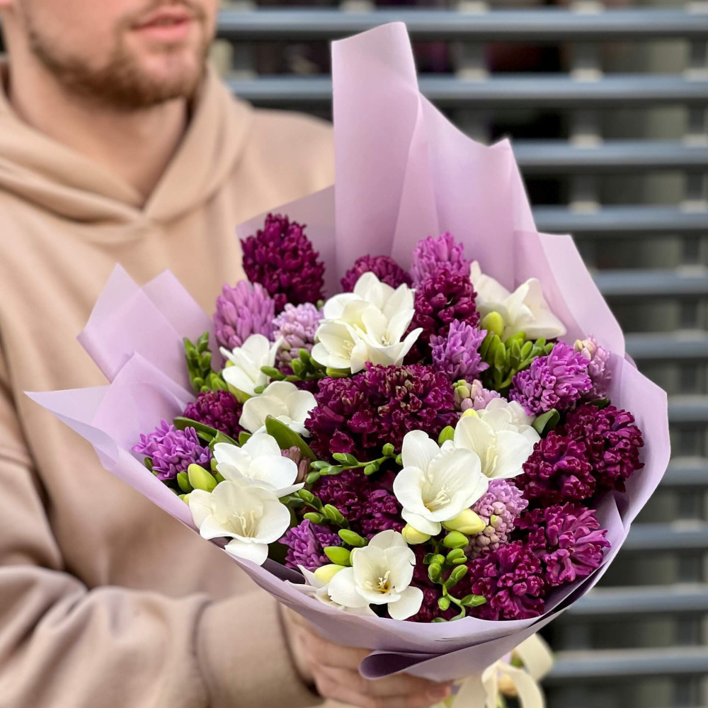 - Як замовити 27 гіацинтів і фрезії у букеті «Пурпурова розкіш»? ❯