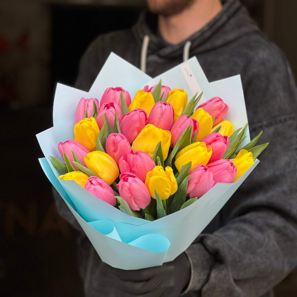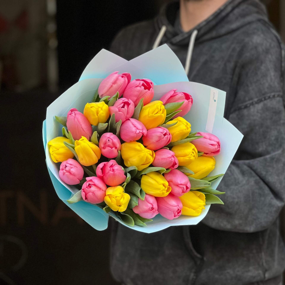 - Як замовити 27 класичних кольорових тюльпанів у букеті «Сонячна ягідка»? ❯