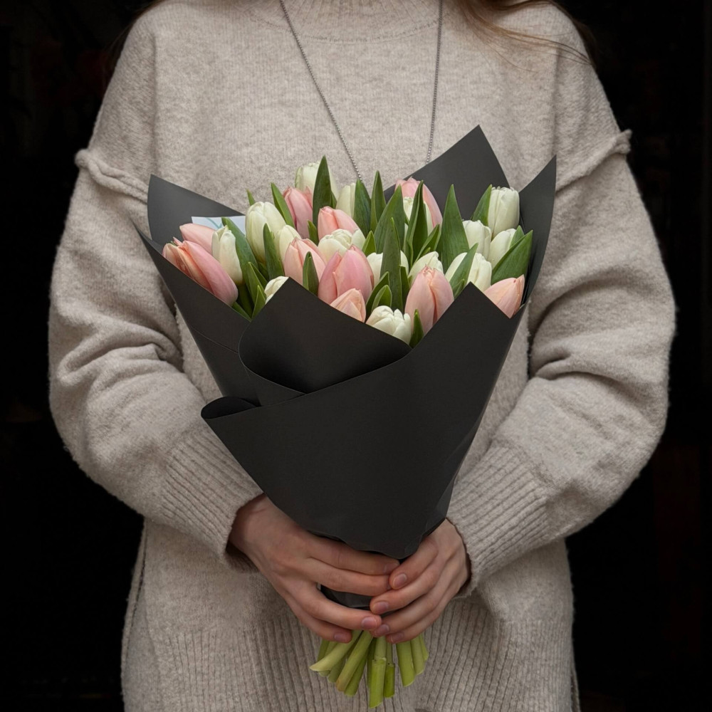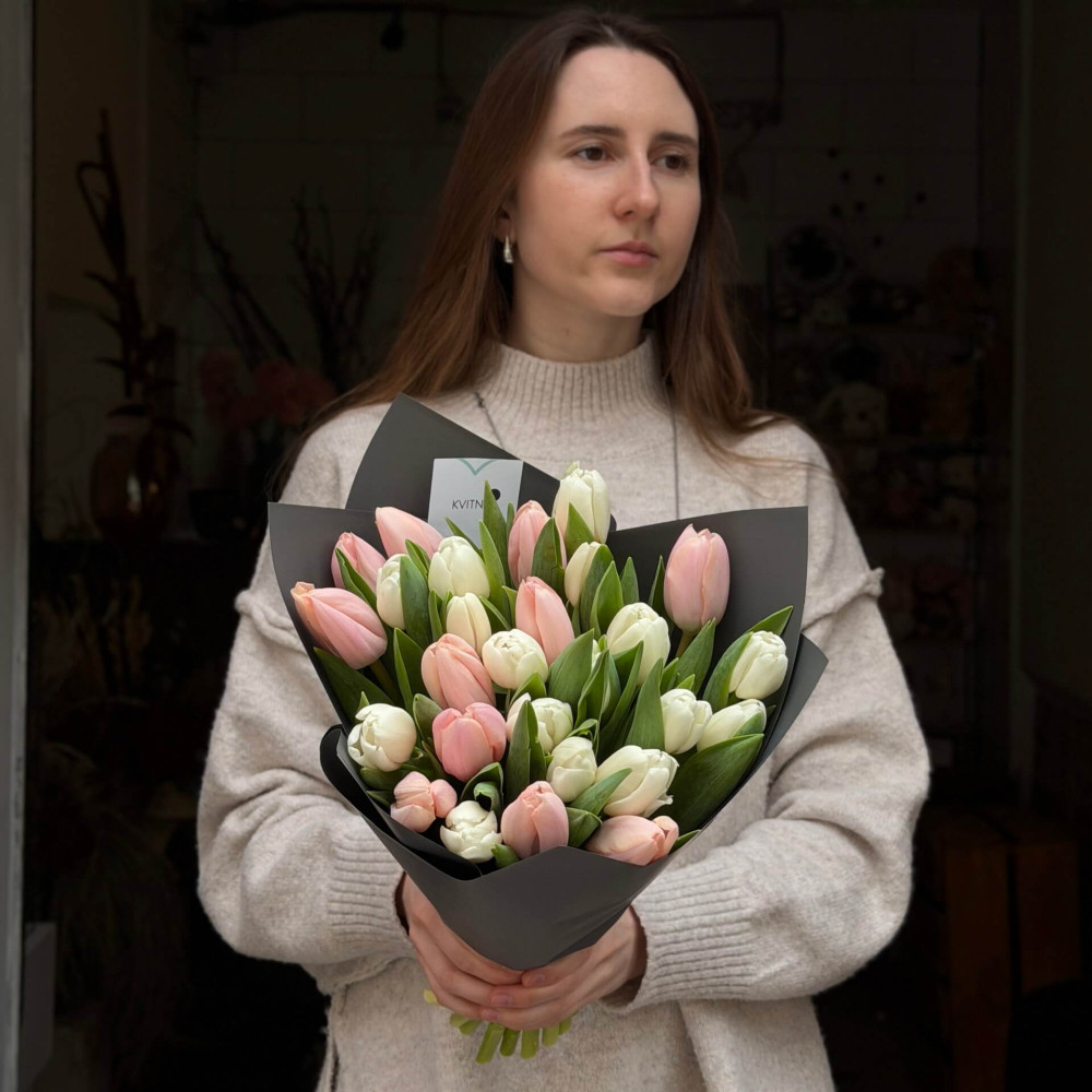 - Як замовити 27 класичних тюльпанів у букеті «Вершковий абрикос»? ❯