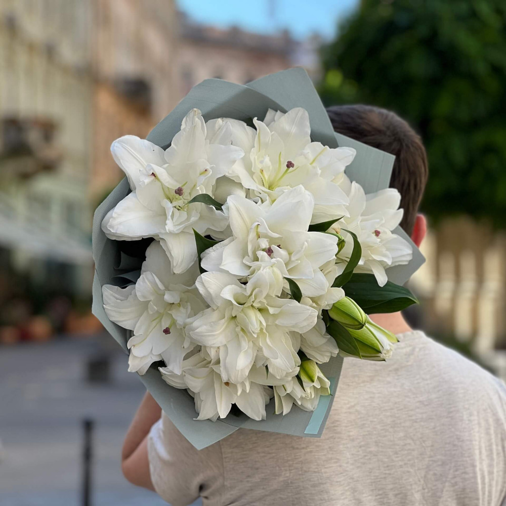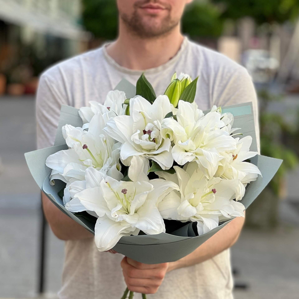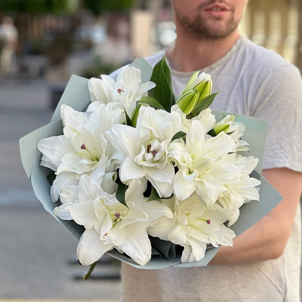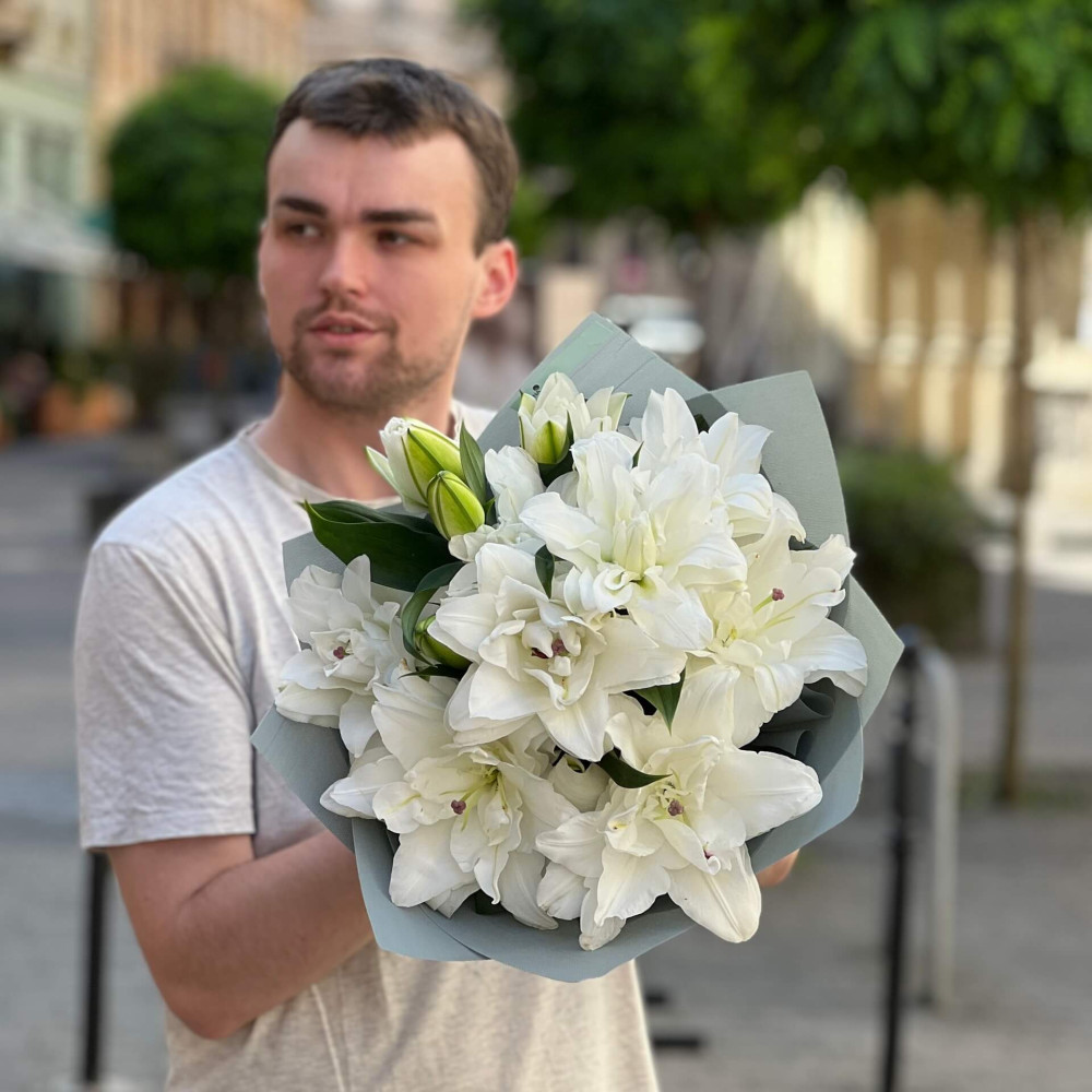 - Як замовити 3 вишукані махрові лілії сорту Chardonnay в букеті «Ангельський аромат»? ❯
