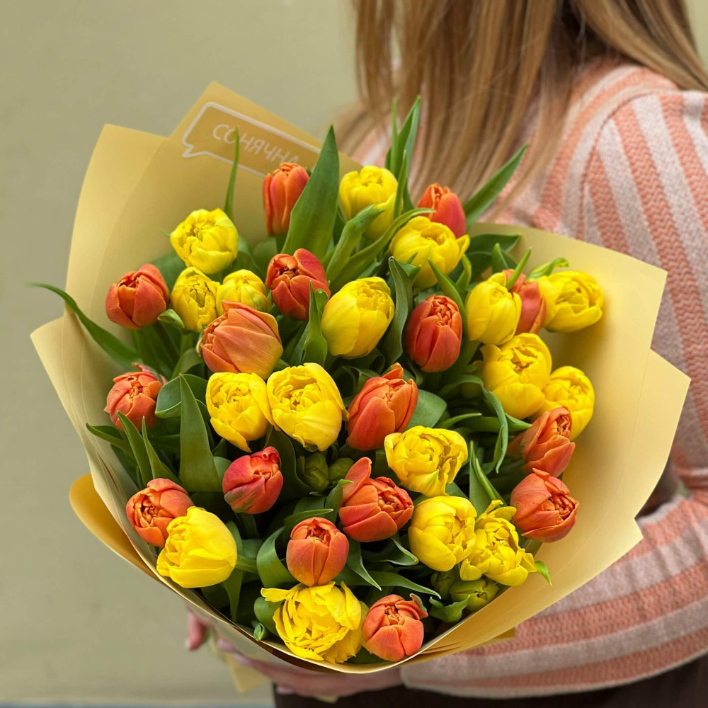 - Як замовити 33 піоновидних тюльпана у букеті «Весела пташечка»? ❯