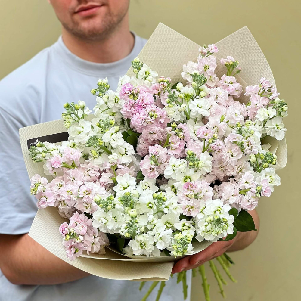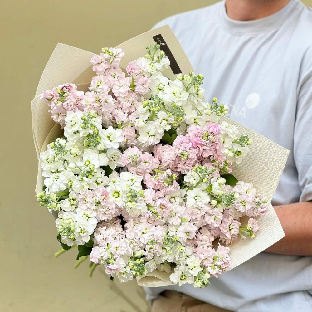 Надзвичайно ароматний букет з біло-рожевої матіоли, який наповнить вишуканим ароматом всю кімнату і буде чудовим подарунком людині, яка любить духмяні квіти.