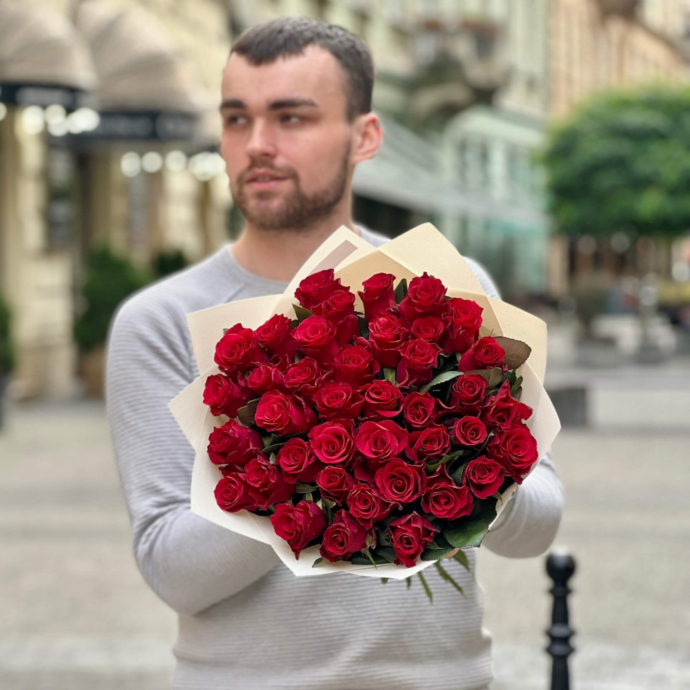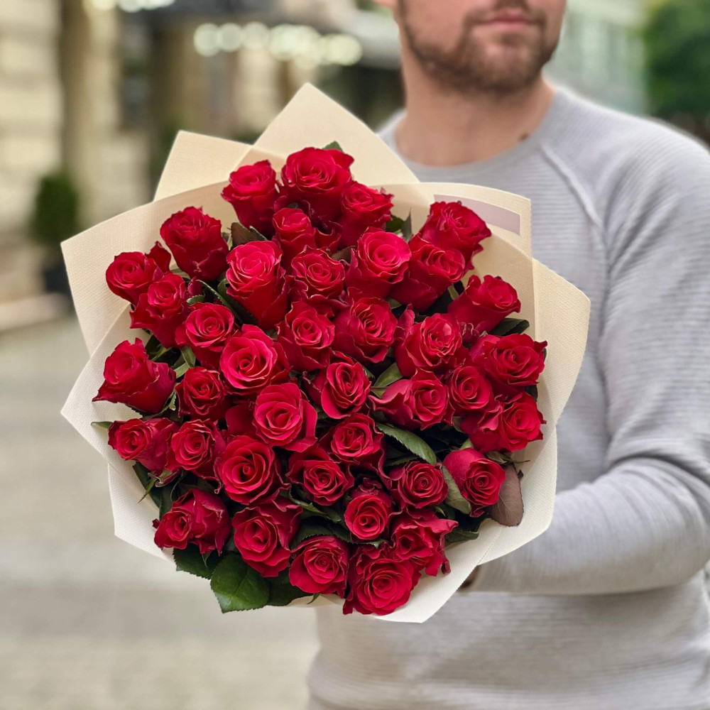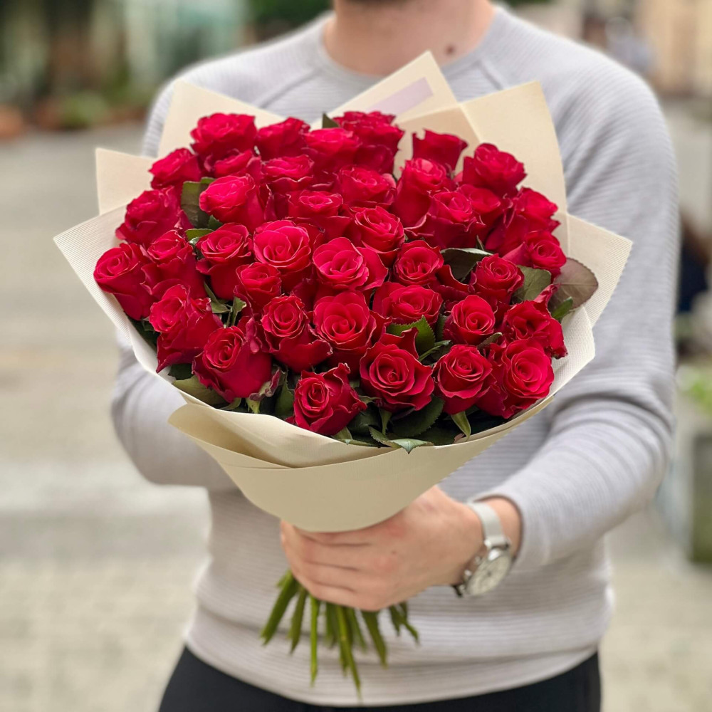 - Як замовити 39 троянд сорту Tacazzi у букеті «Кенійський джем»? ❯