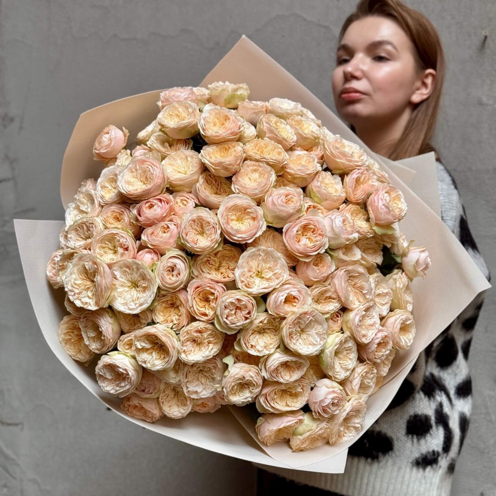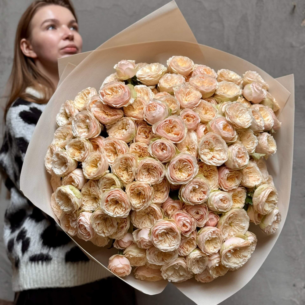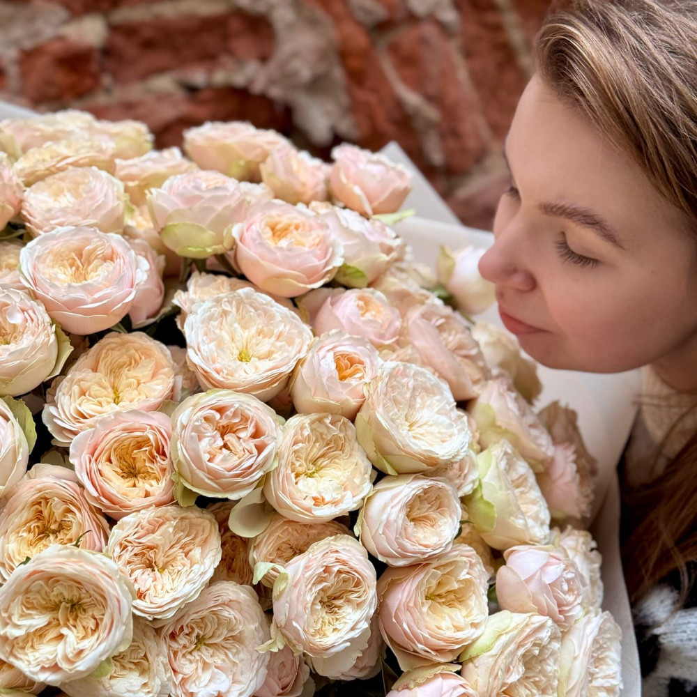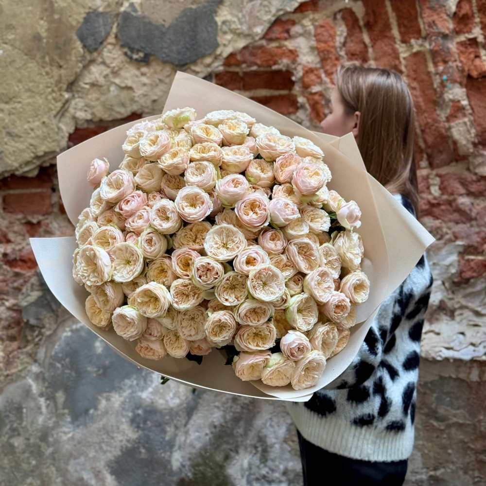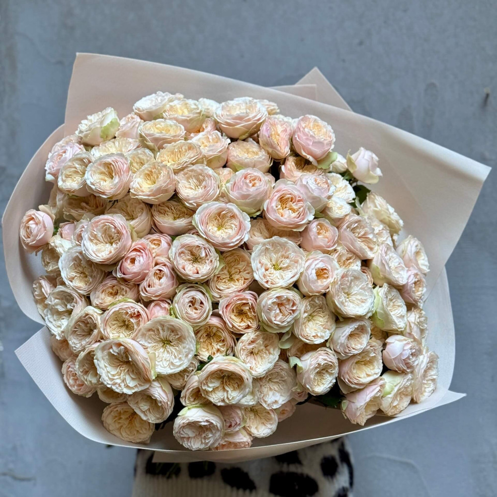 - Як замовити 45 гілок кущової піоновидної троянди Darlington у букеті «Розкішний крем»? ❯