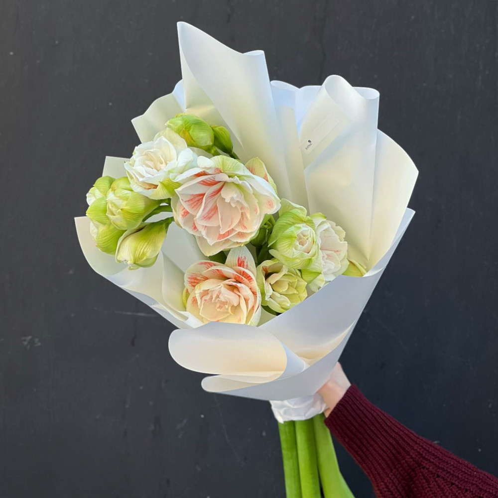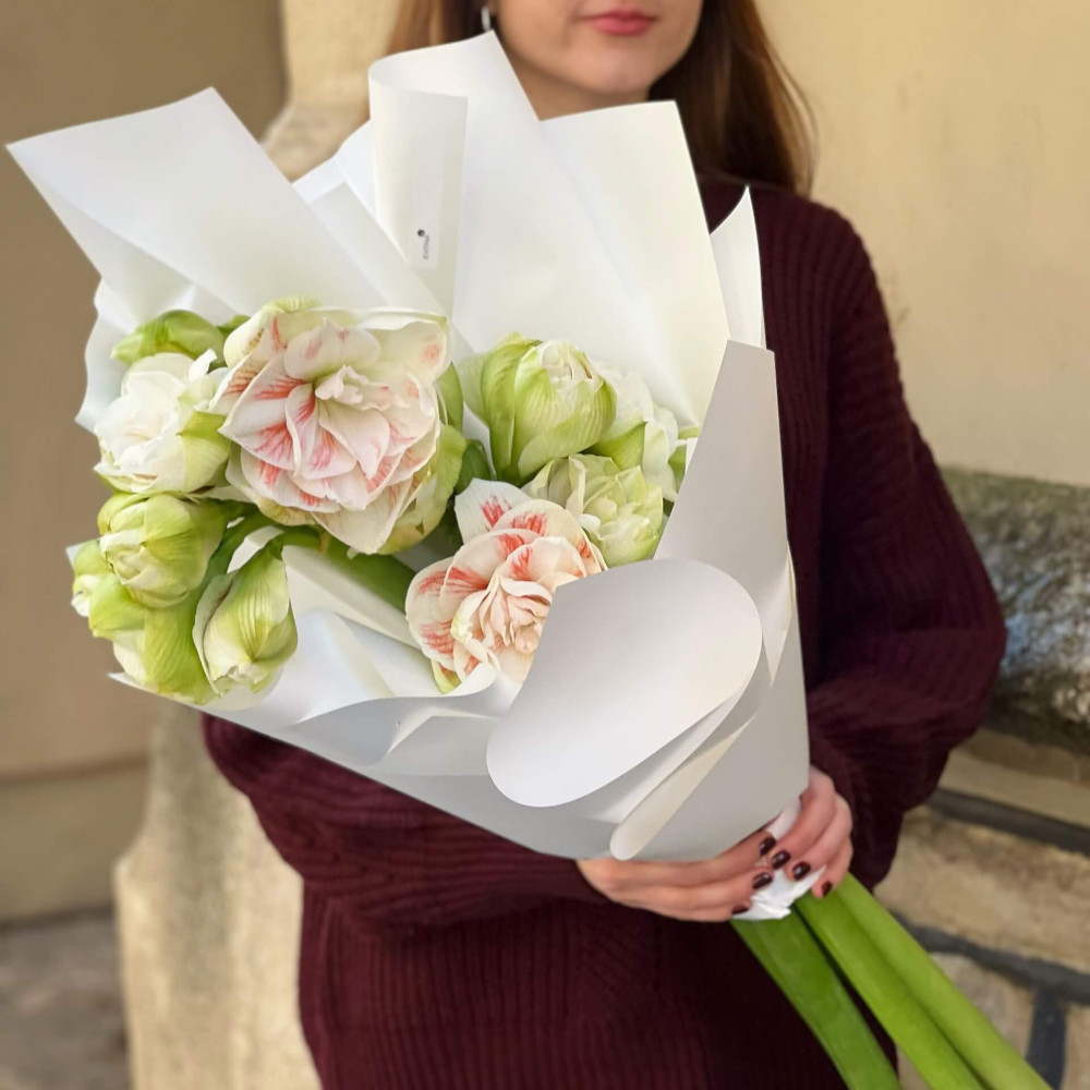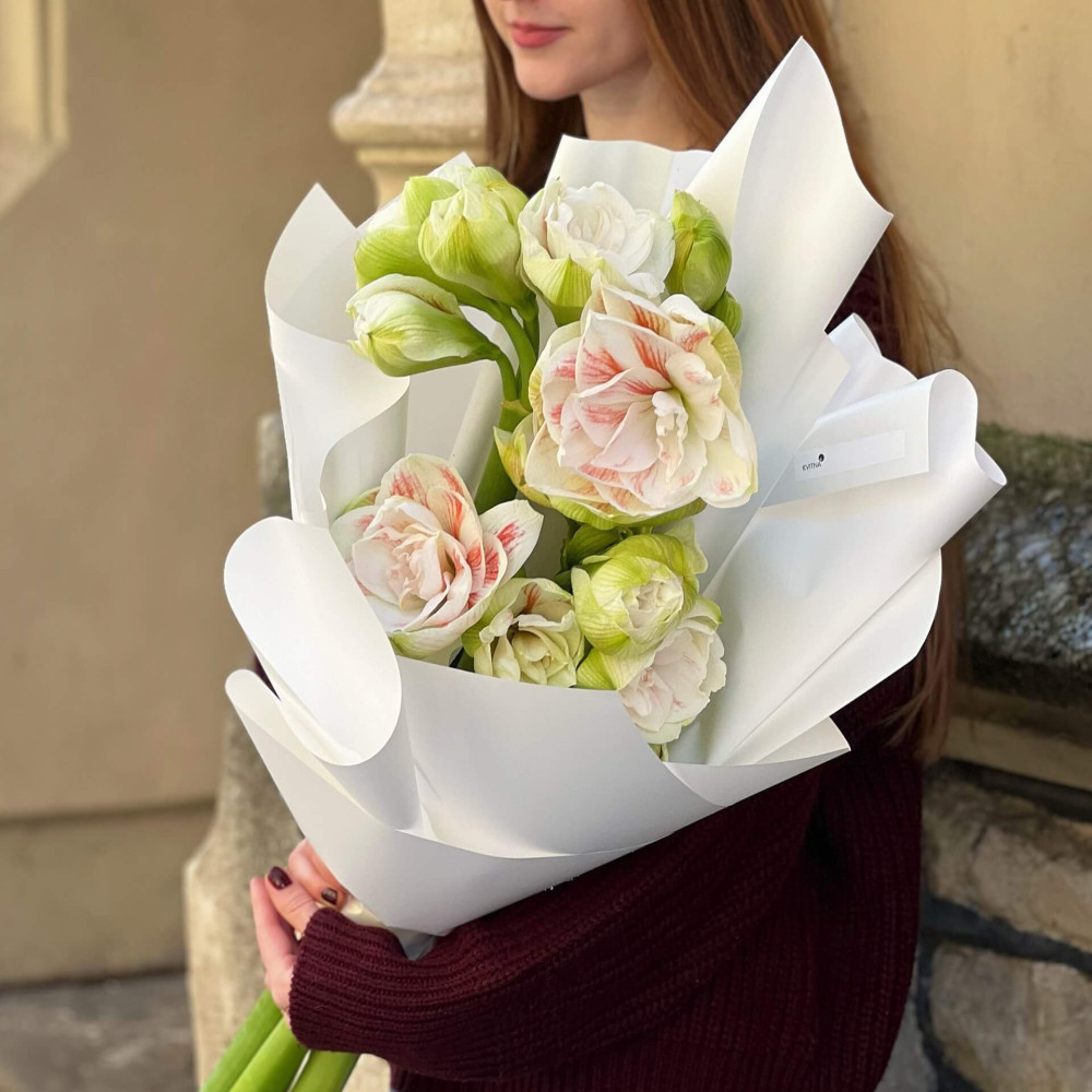 - Як замовити 5 білих амарилісів у букеті «Ніжна зірка»? ❯