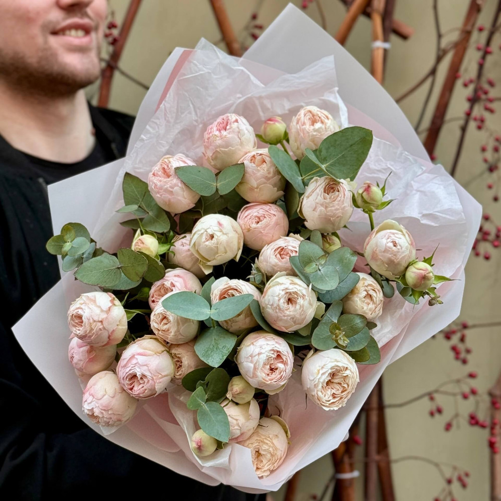 Квіти: Троянда піоновидна кущова сорту Mansfield Park - 5 гілок, Евкаліпт
