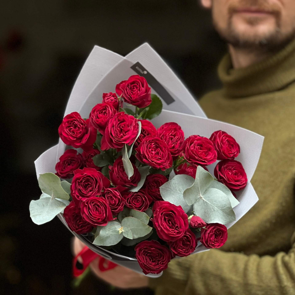 - Як замовити 5 гілок кущової троянди Red Trendsetter у букеті «Вишневе мереживо»? ❯
