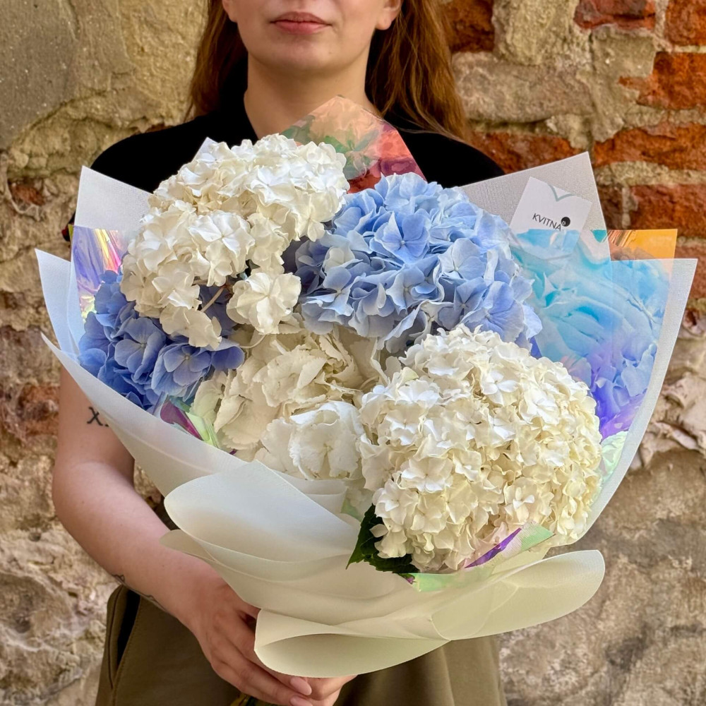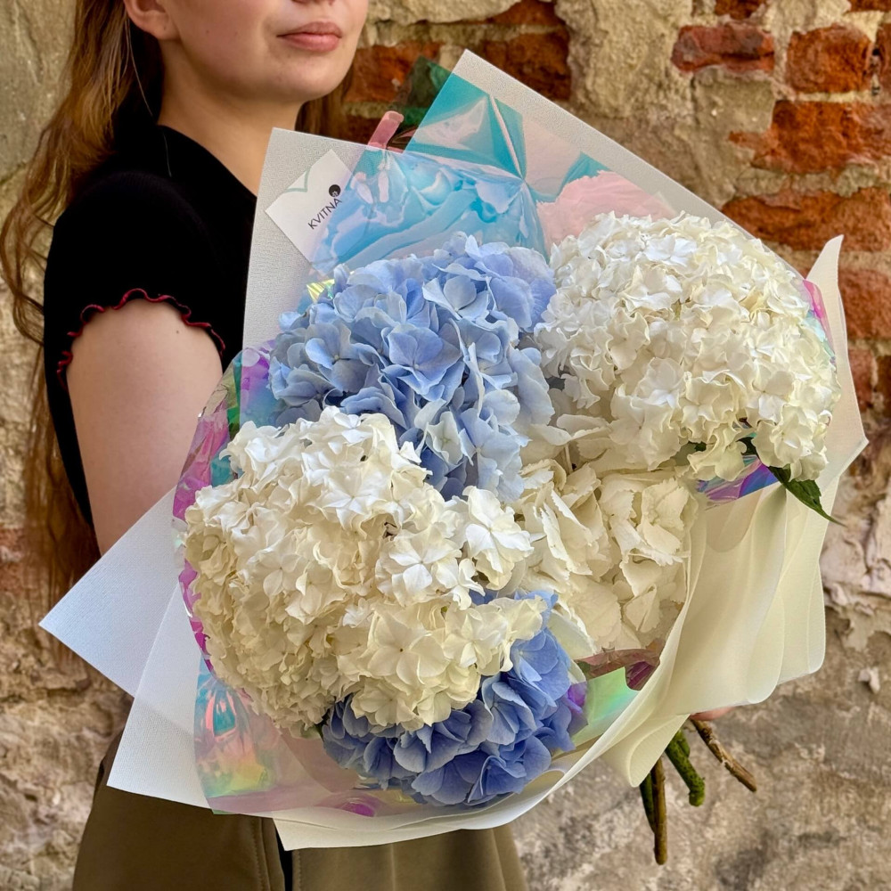 - Як замовити 5 гортензій у букеті «Хмаринки в небі»? ❯