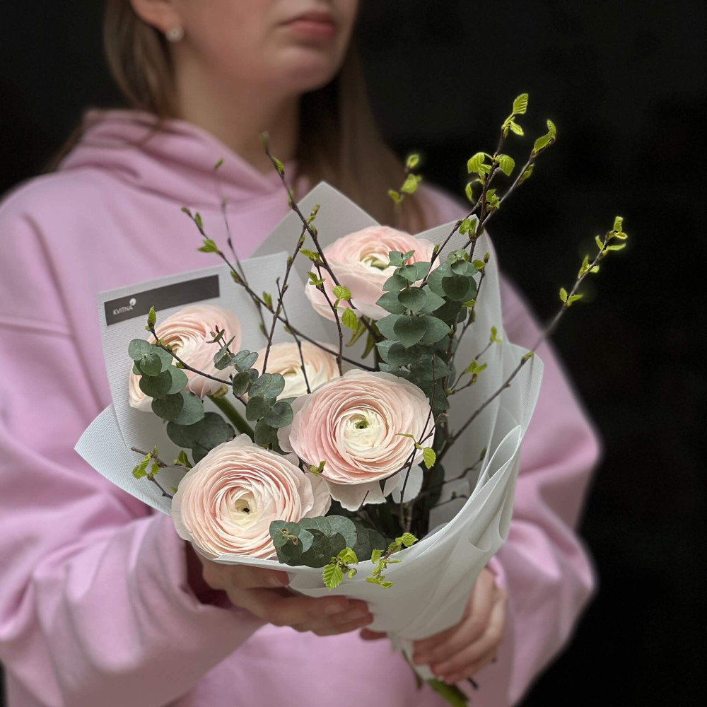 Як замовити 5 ніжних ранункулюсів Clooney Hanoi у букеті «Березневе пробудження»?