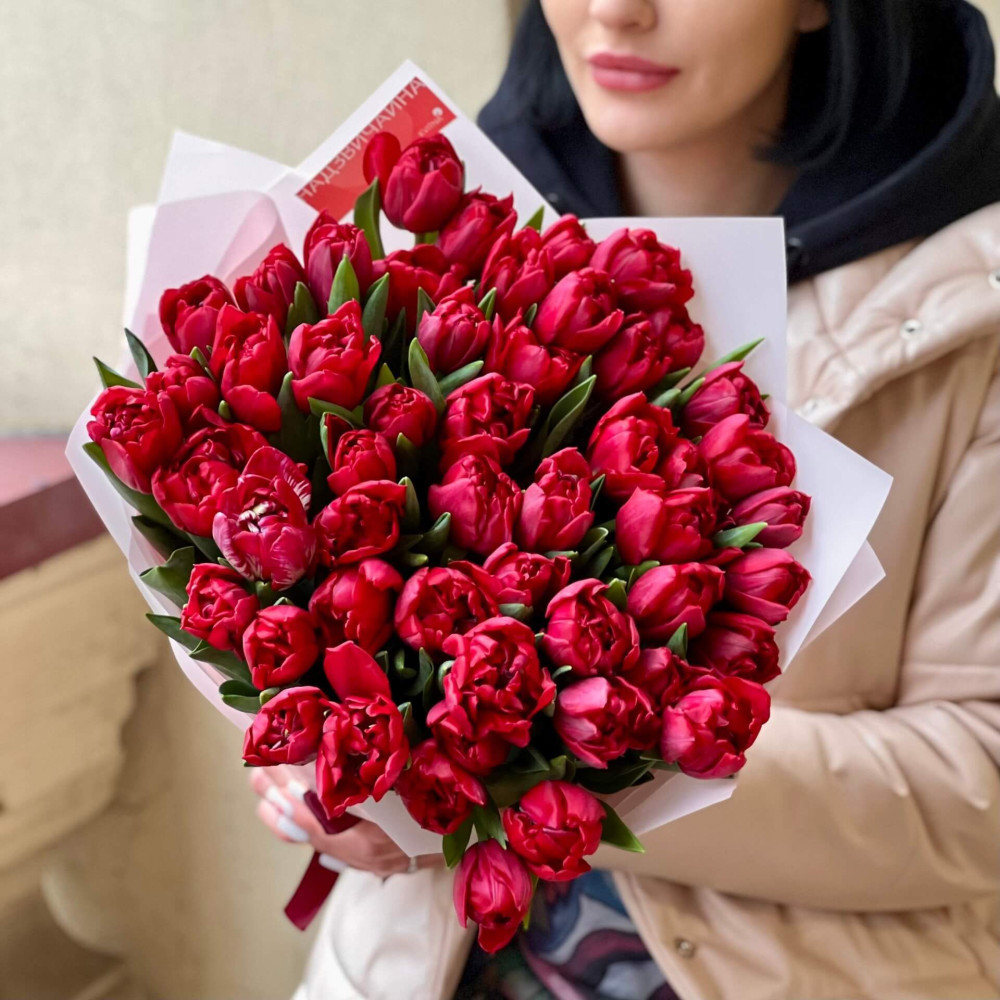 - Як замовити 51 червоний піоновидний тюльпан у букеті «Яскраві цукерочки»? ❯