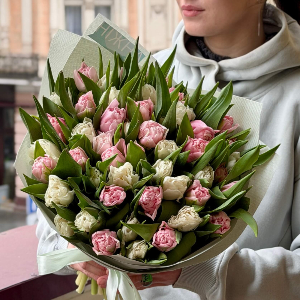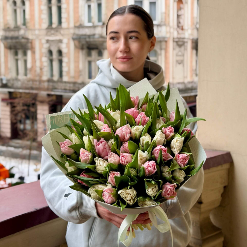 - Як замовити 51 преміальний тюльпан сорту Dreamer та Du Fortaleza у букеті «Дотик любові»? ❯