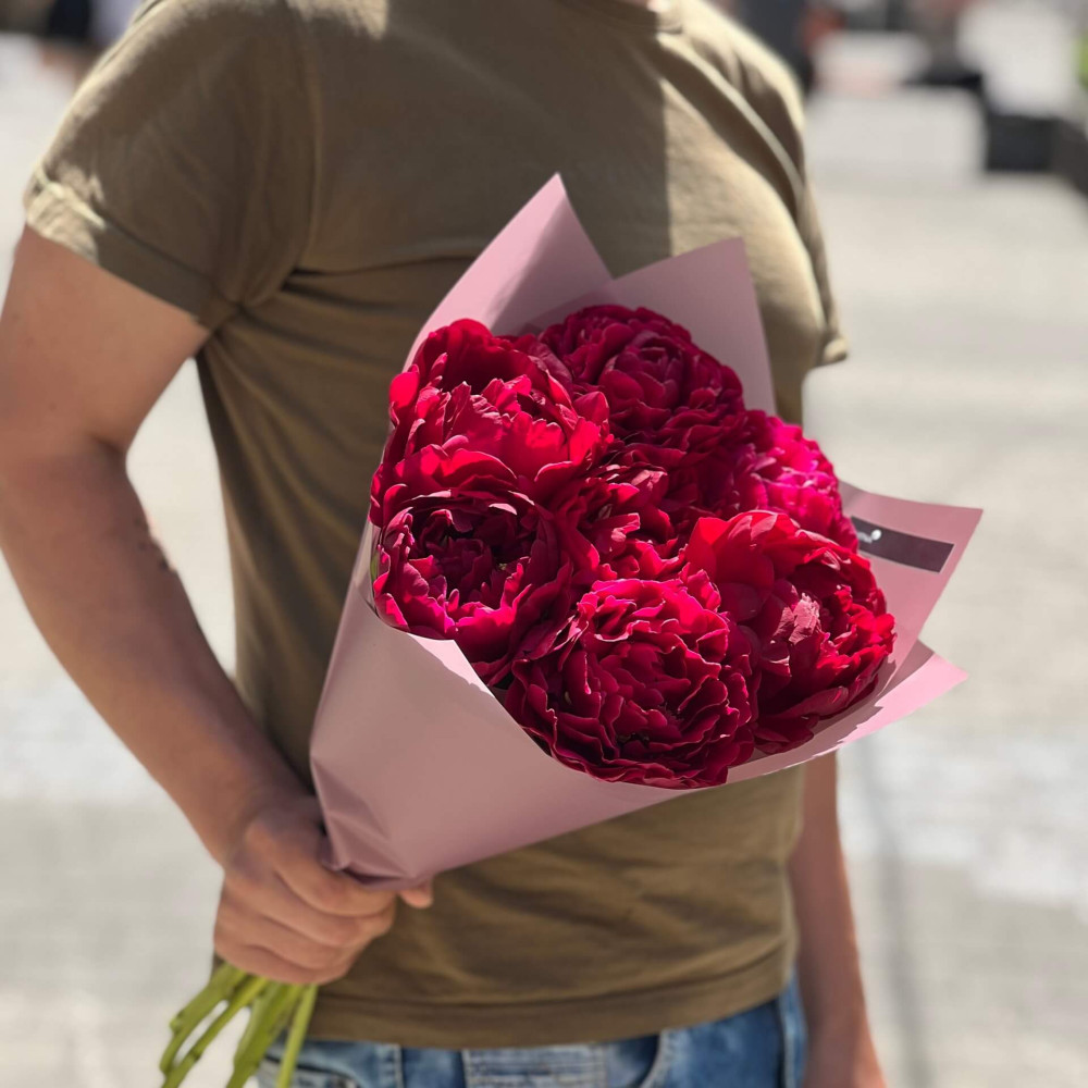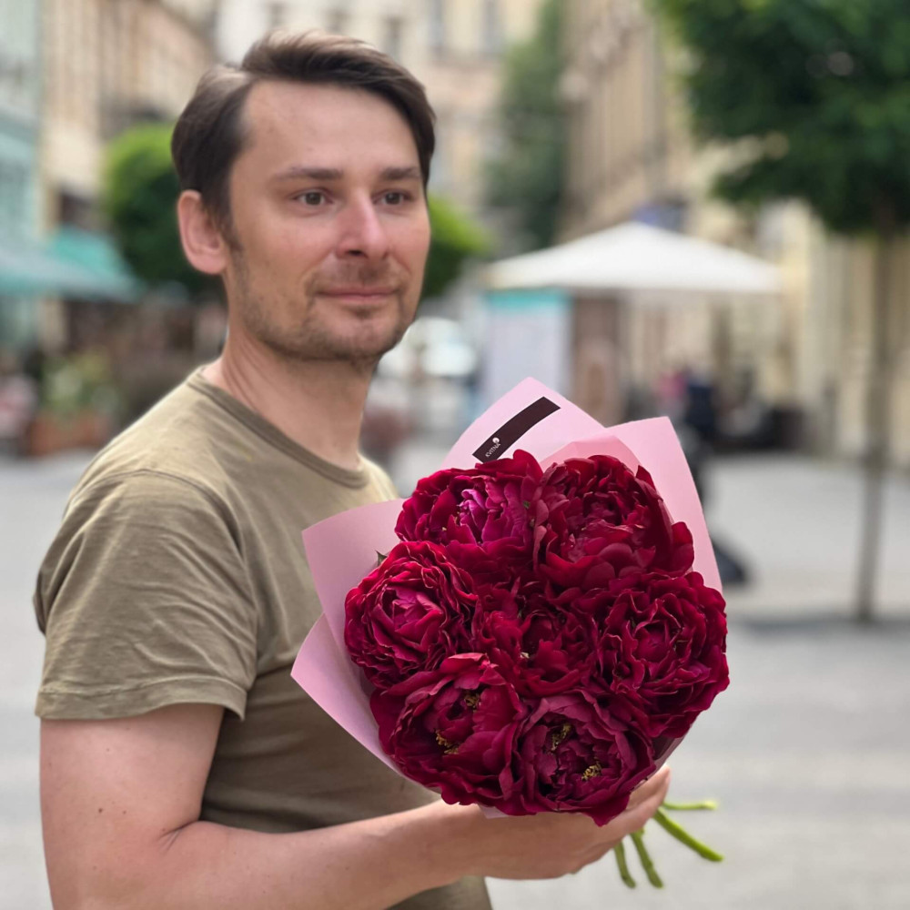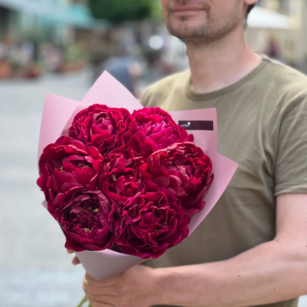 - Як замовити 7 бордових півоній Old Faithful у букеті «Смак черешні»? ❯