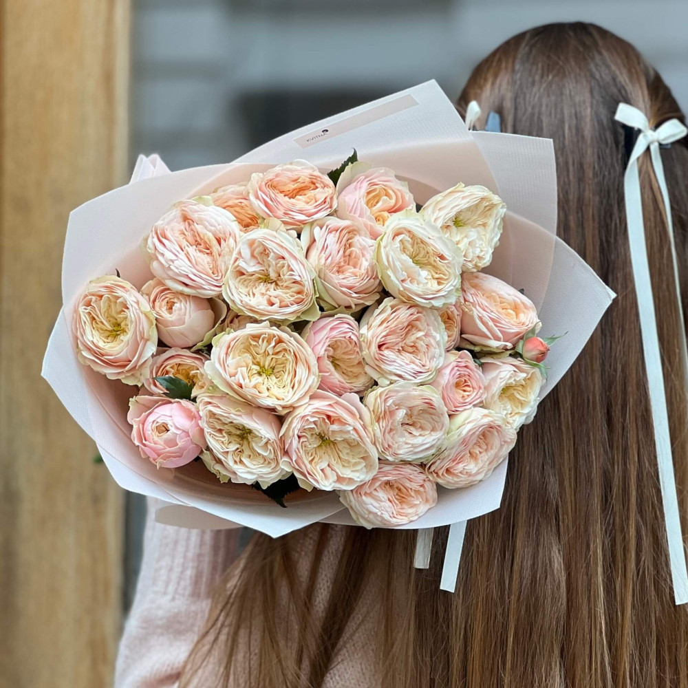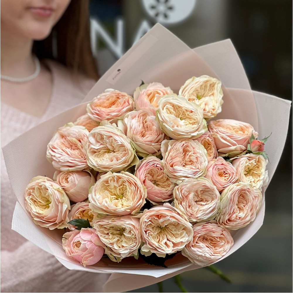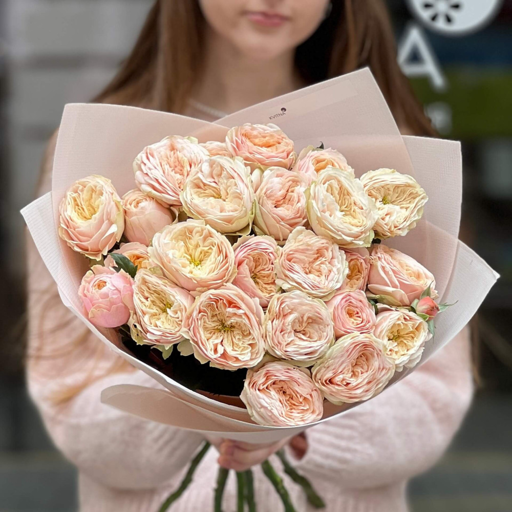 - Як замовити 7 гілок піоновидної кущової троянди Darlington у букеті «Несподіване натхнення»? ❯