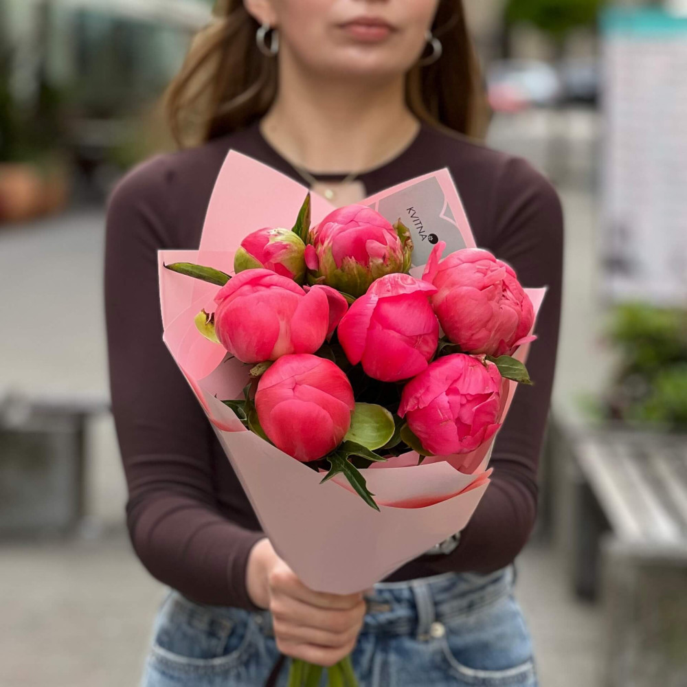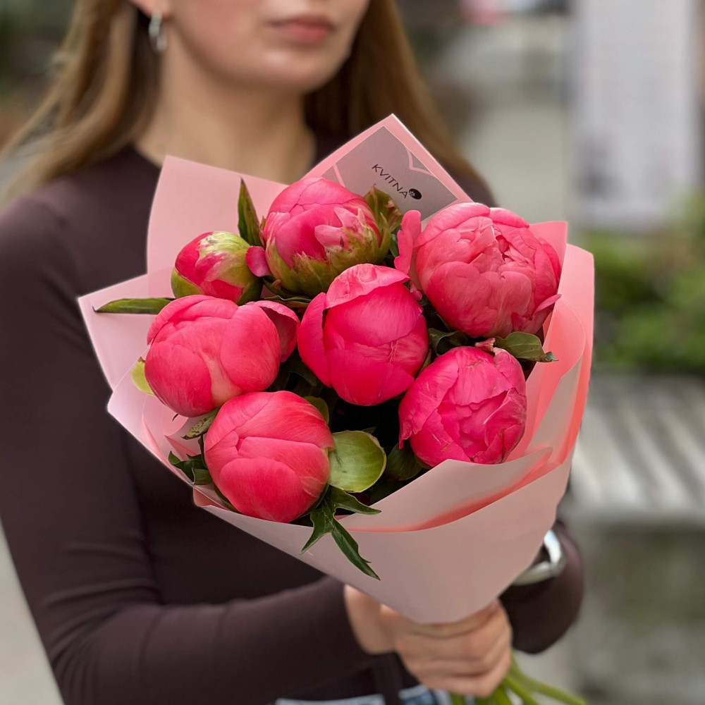 - Як замовити 7 яскравих півоній Coral Charm у букеті «Тропічний сансет»? ❯