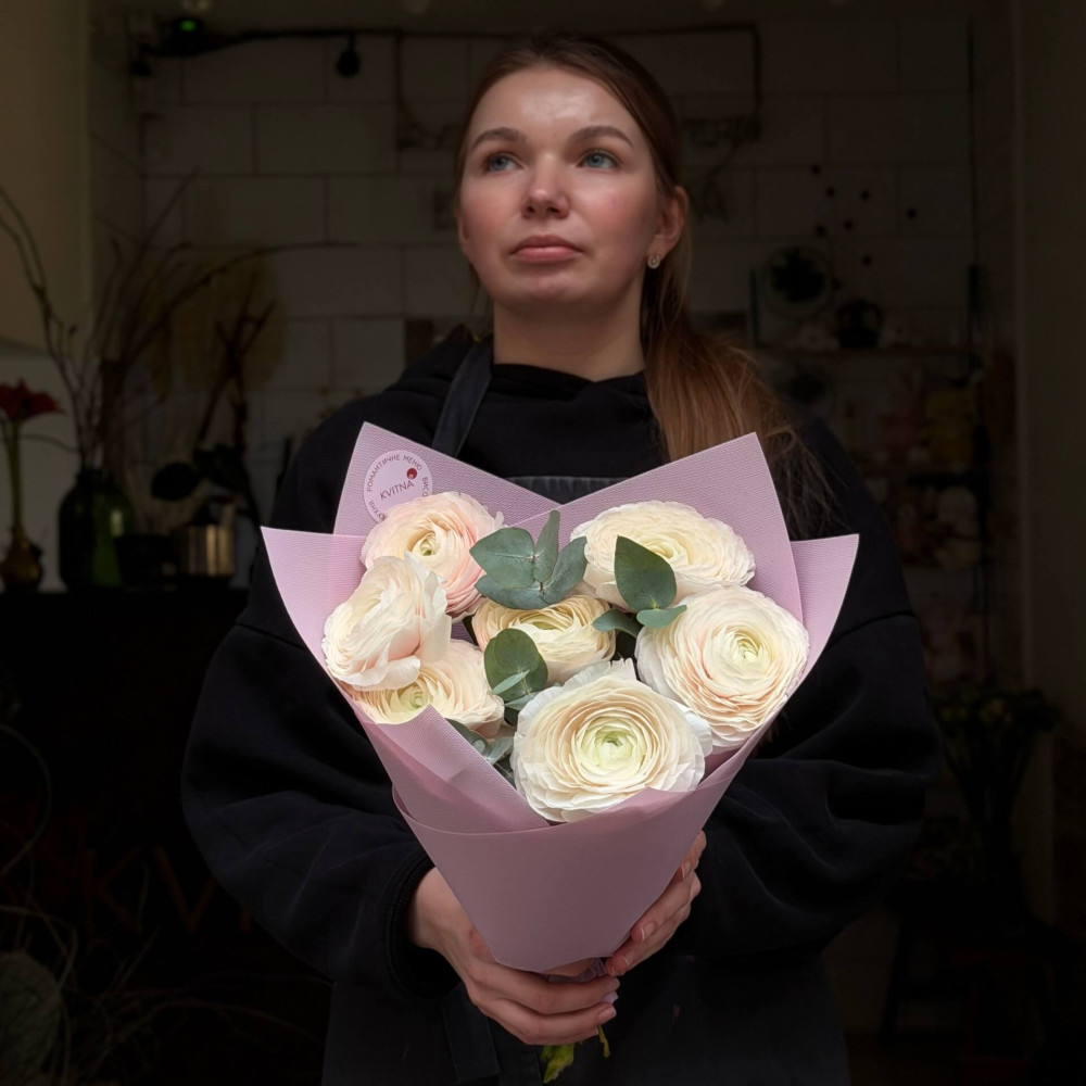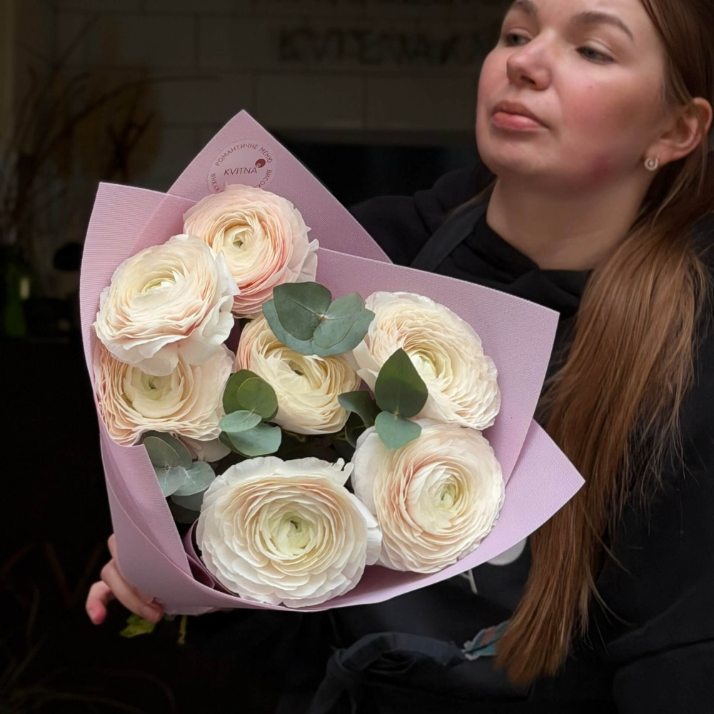 - Як замовити 7 пудрових ранункулюсів Clooney Hanoi та евкаліпт у букеті «Мереживні хмаринки»? ❯