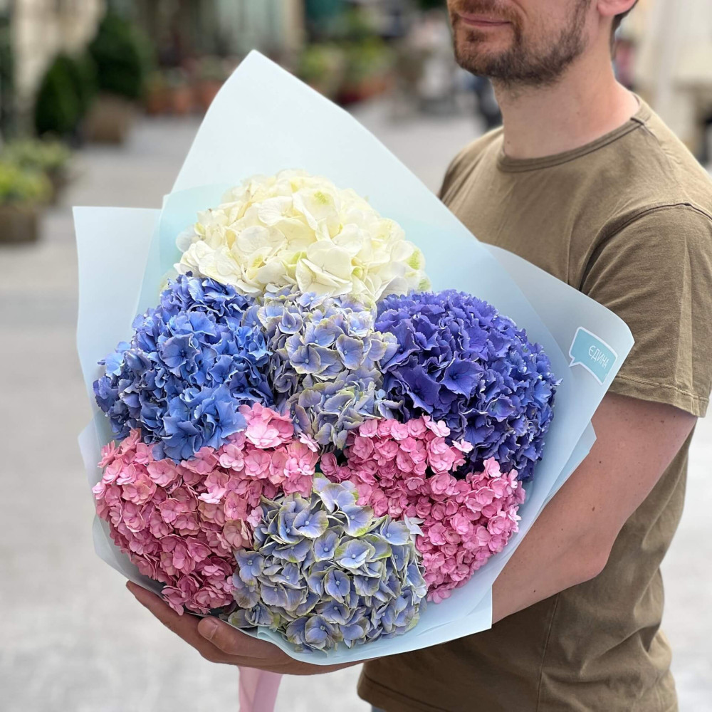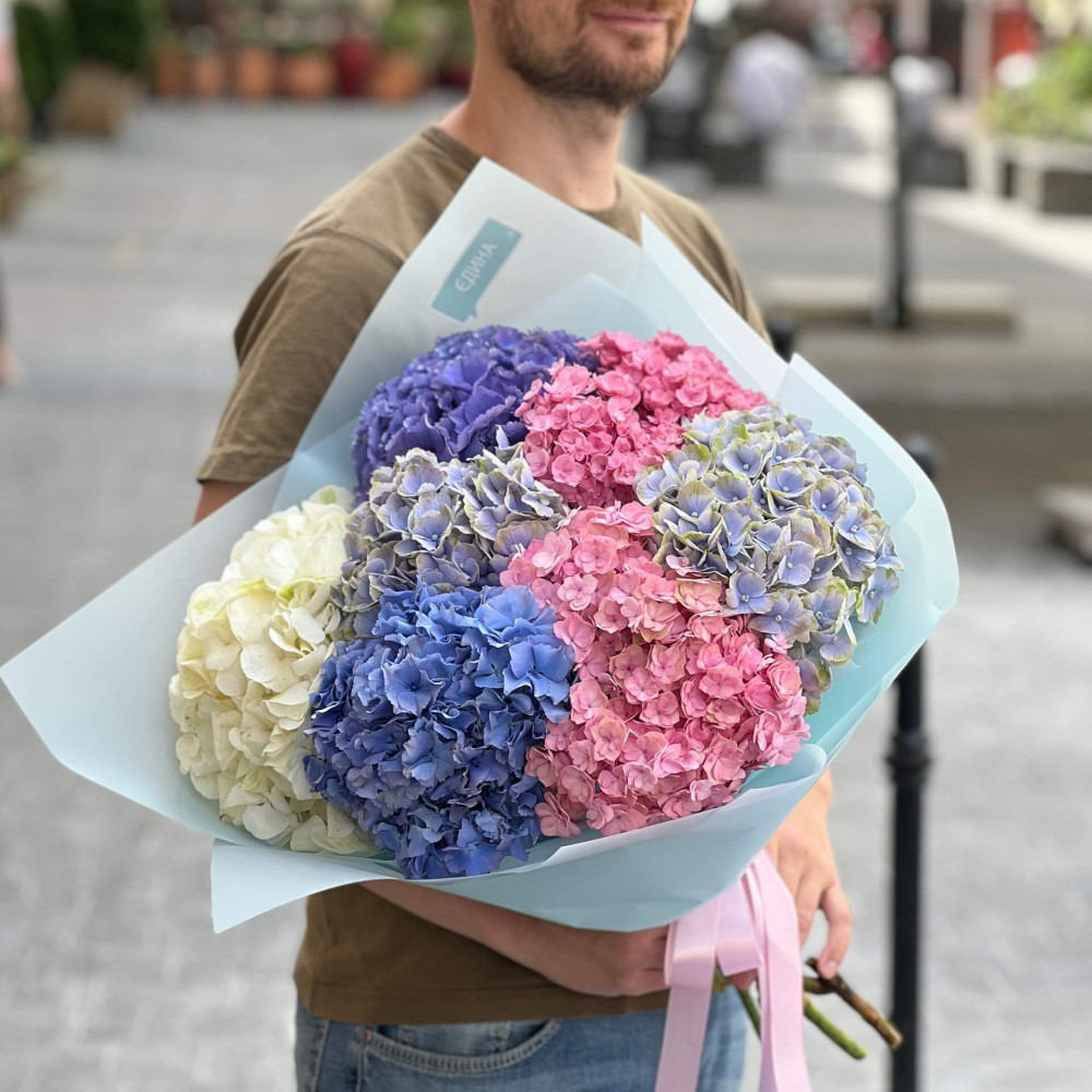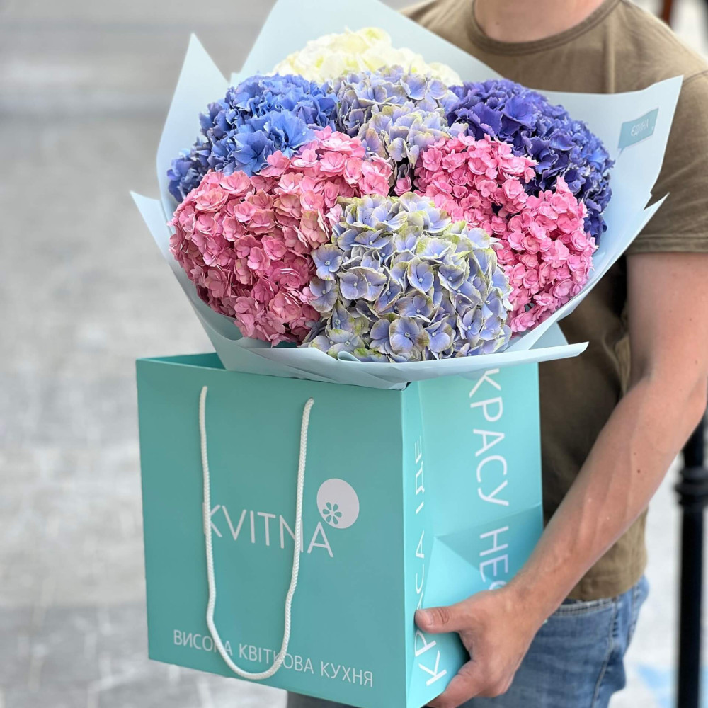 - Як замовити 7 різнобарвних гортензій у букеті «Львівський світанок»? ❯