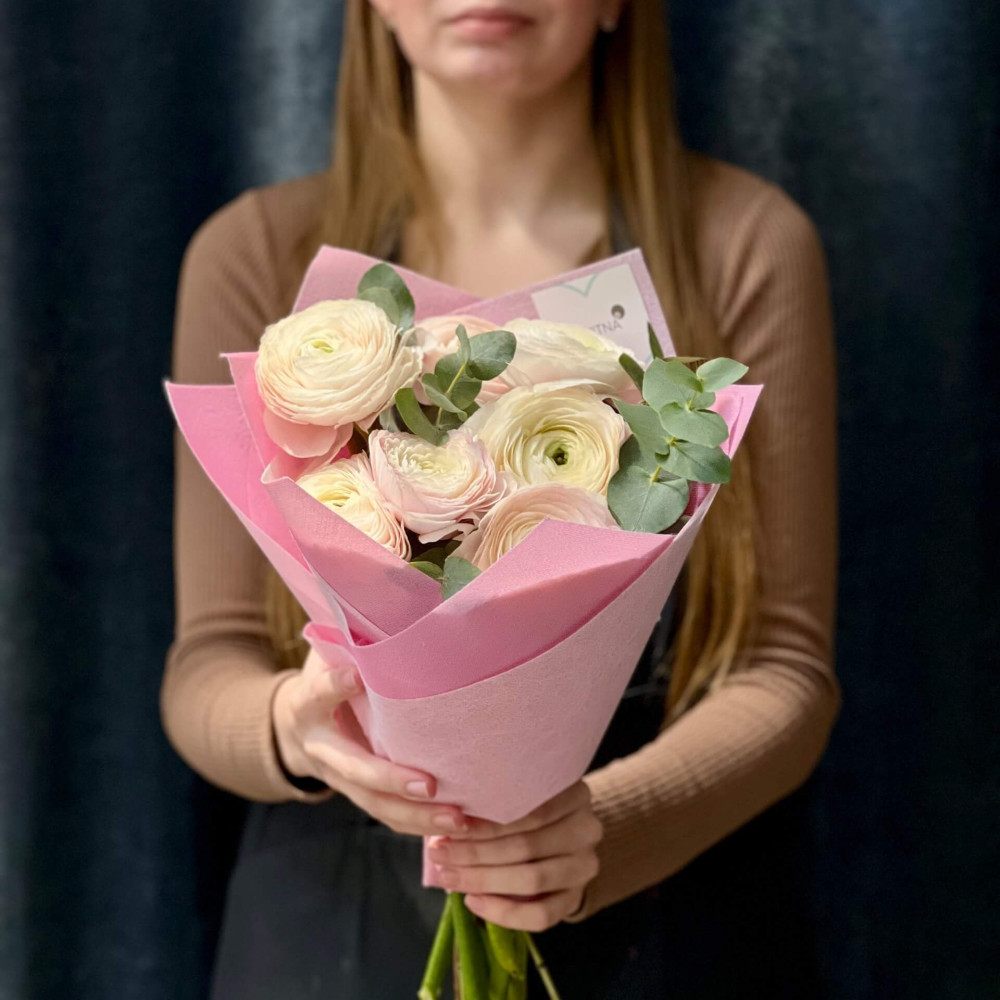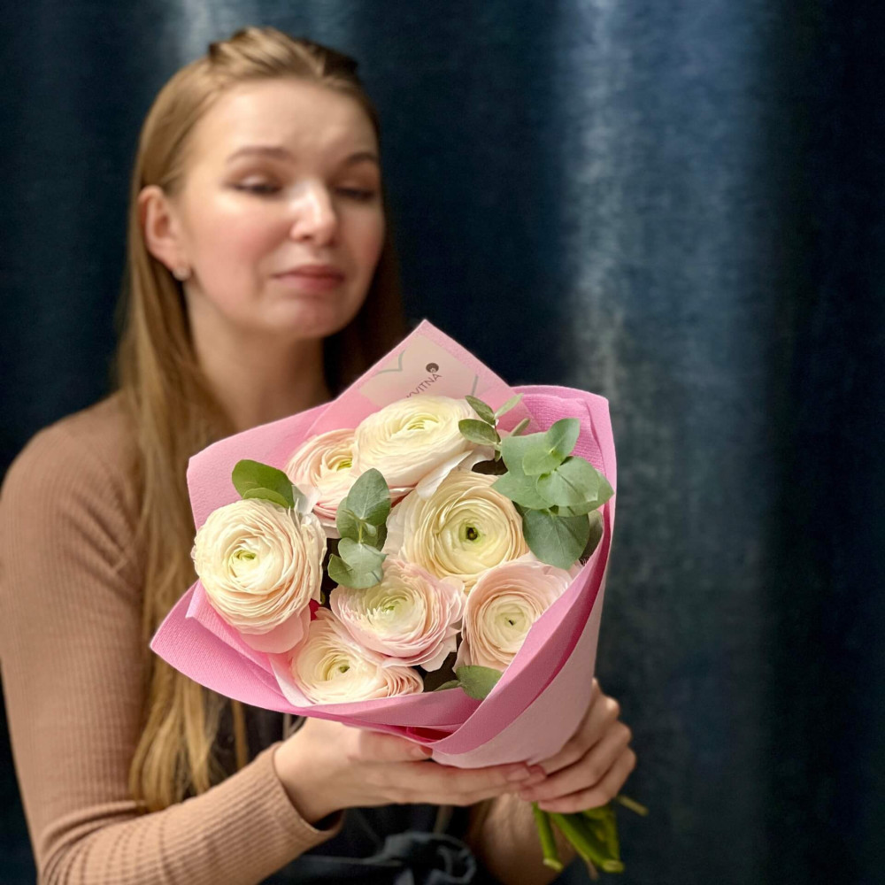 - Як замовити 7 світлих ранункулюсів Clooney Hanoi у букеті «Ніжна пудра»? ❯