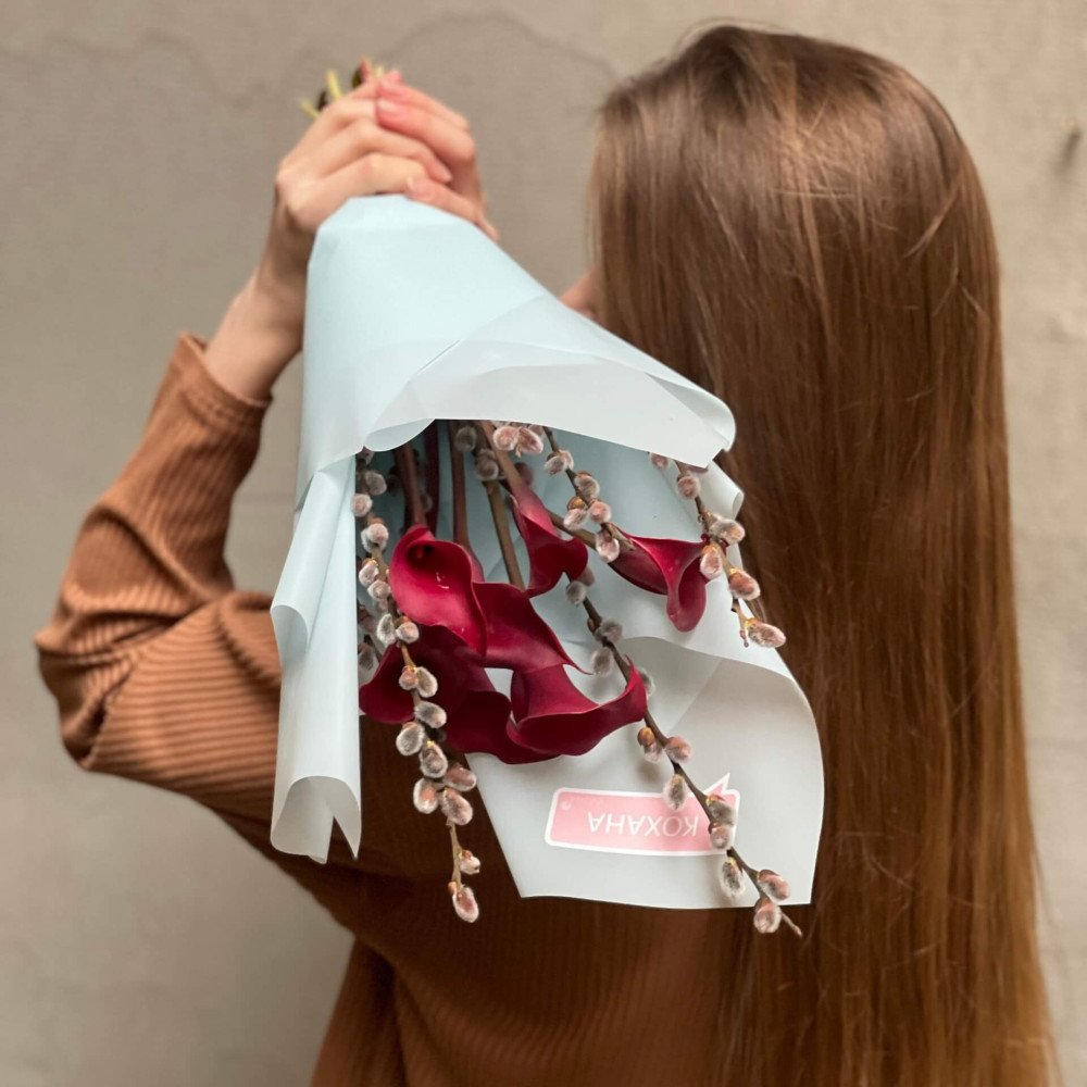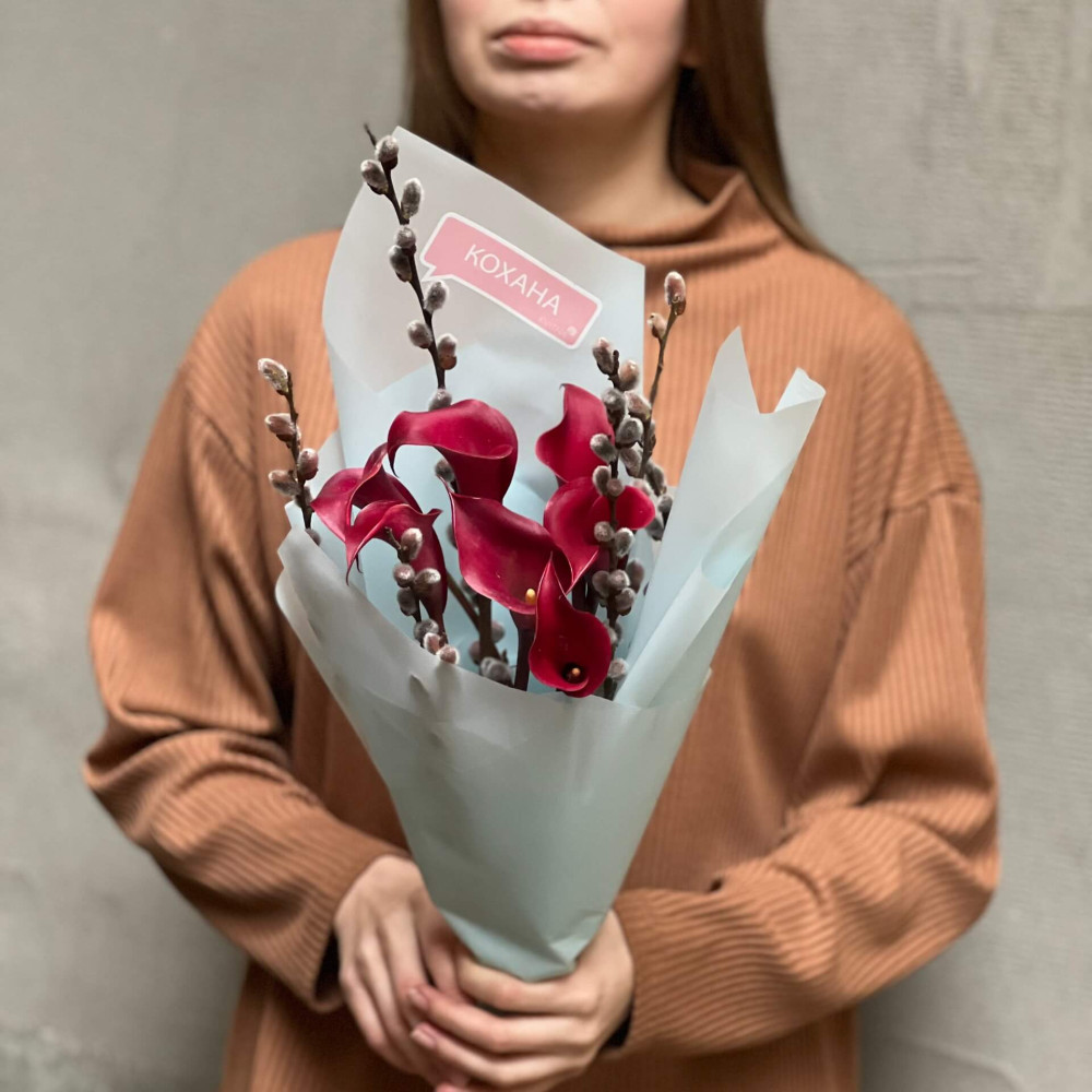 - Як замовити 7 вишуканих бордових калл та вербові гілочки у букеті «Рубінові котики»? ❯
