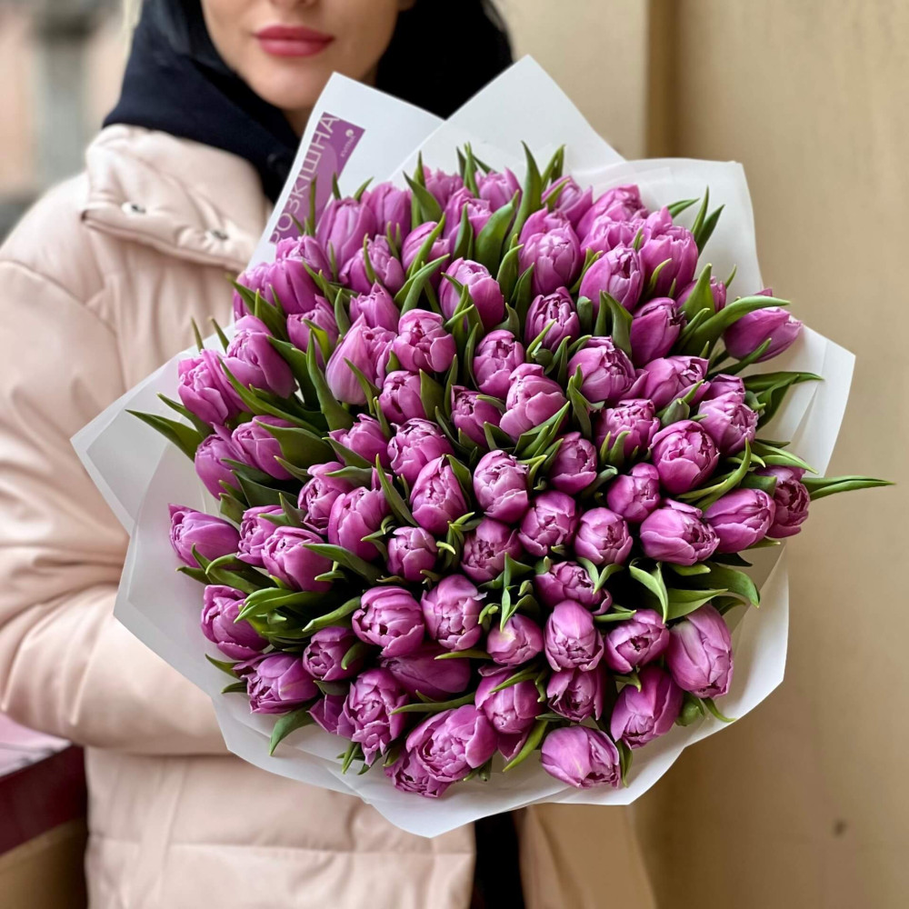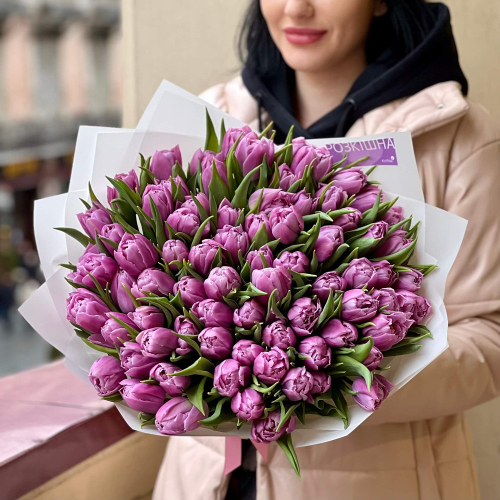 - Як замовити 75 бузкових тюльпанів у букеті «Романтична весна»? ❯