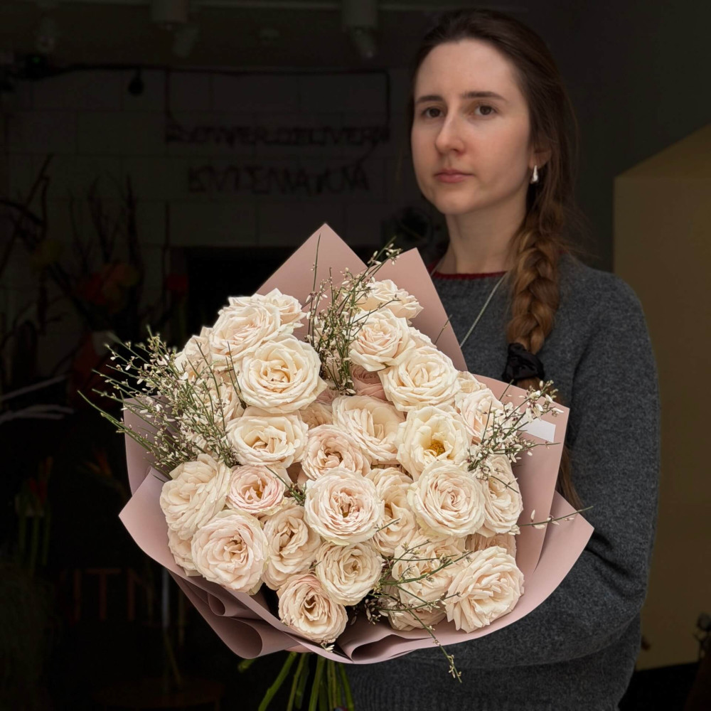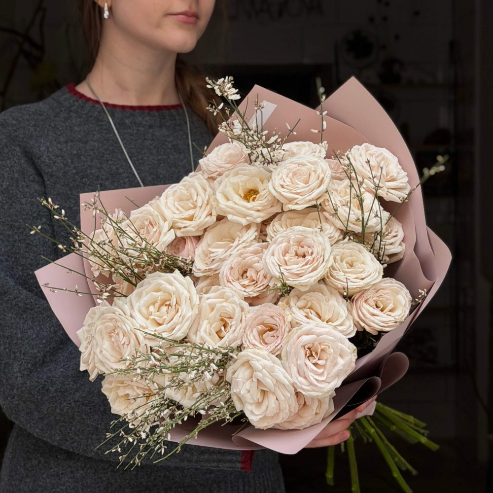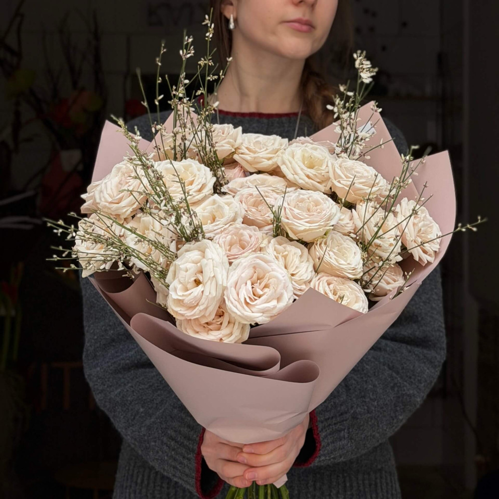 - Як замовити 9 гілок кущової півонієвидної троянди Wangari Maathai та геніста у букеті «Білий танок»? ❯