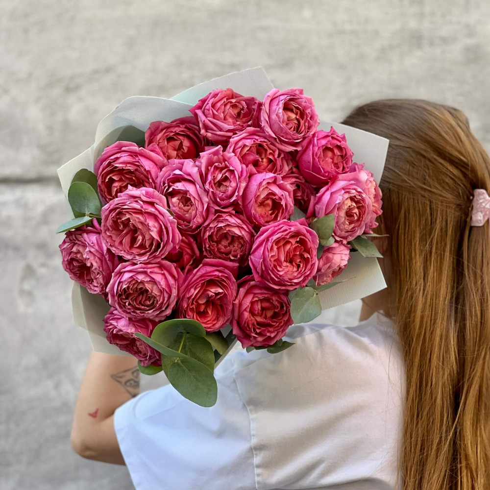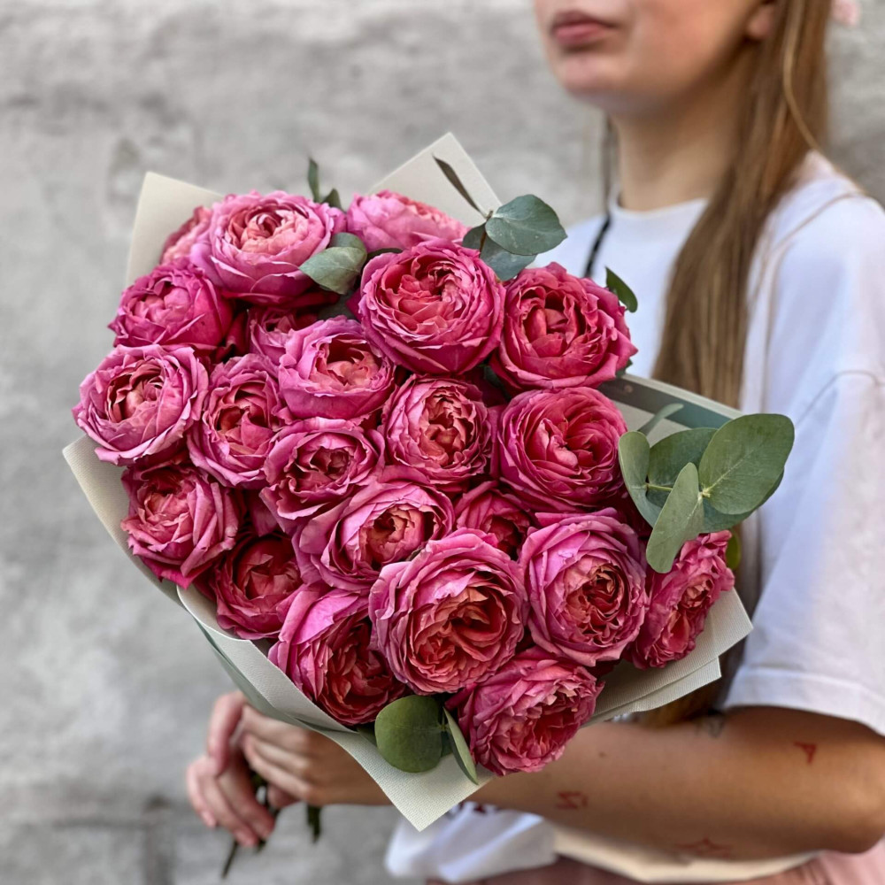 - Як замовити 9 гілок малинової кущової піоновидної троянди Juliet у букеті «Трояндове натхнення»? ❯