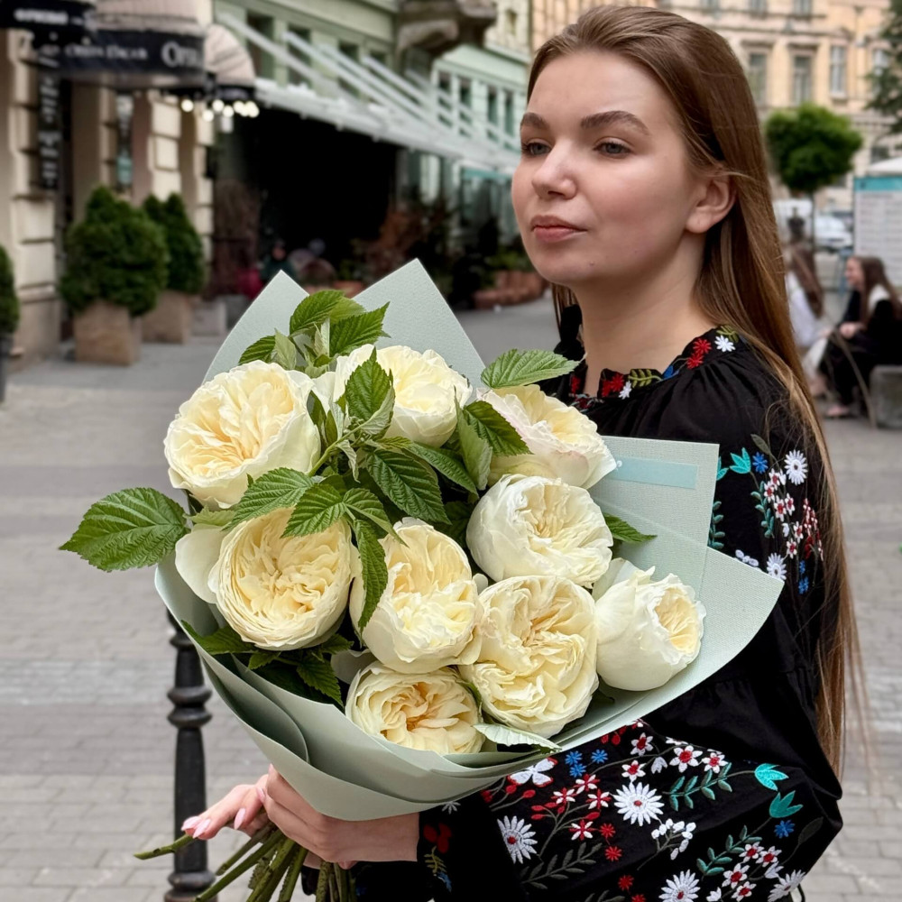 - Як замовити 9 ніжних півонієвидних троянд Aurora Gardens у букеті «Ранкова хмаринка»? ❯