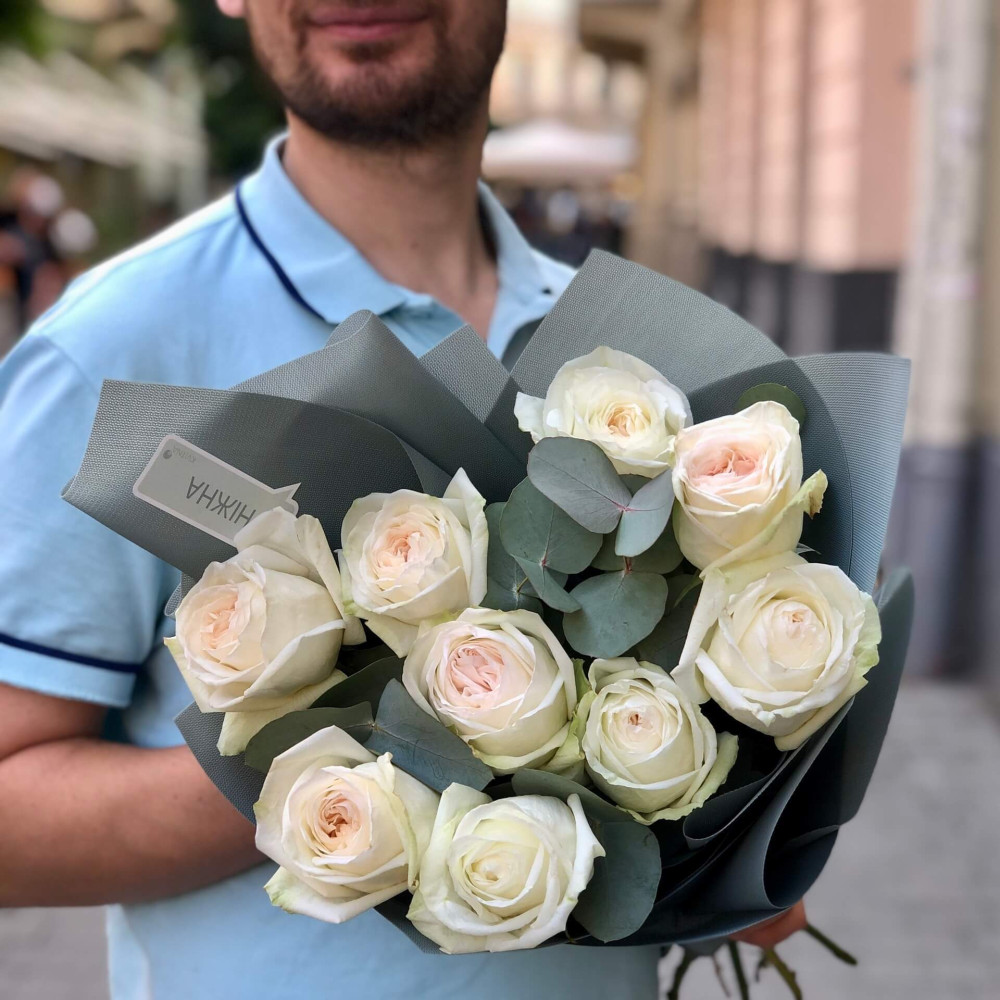 - Як замовити 9 піоновидних троянд White O'Hara у букеті «Шовкова пелюстка»? ❯