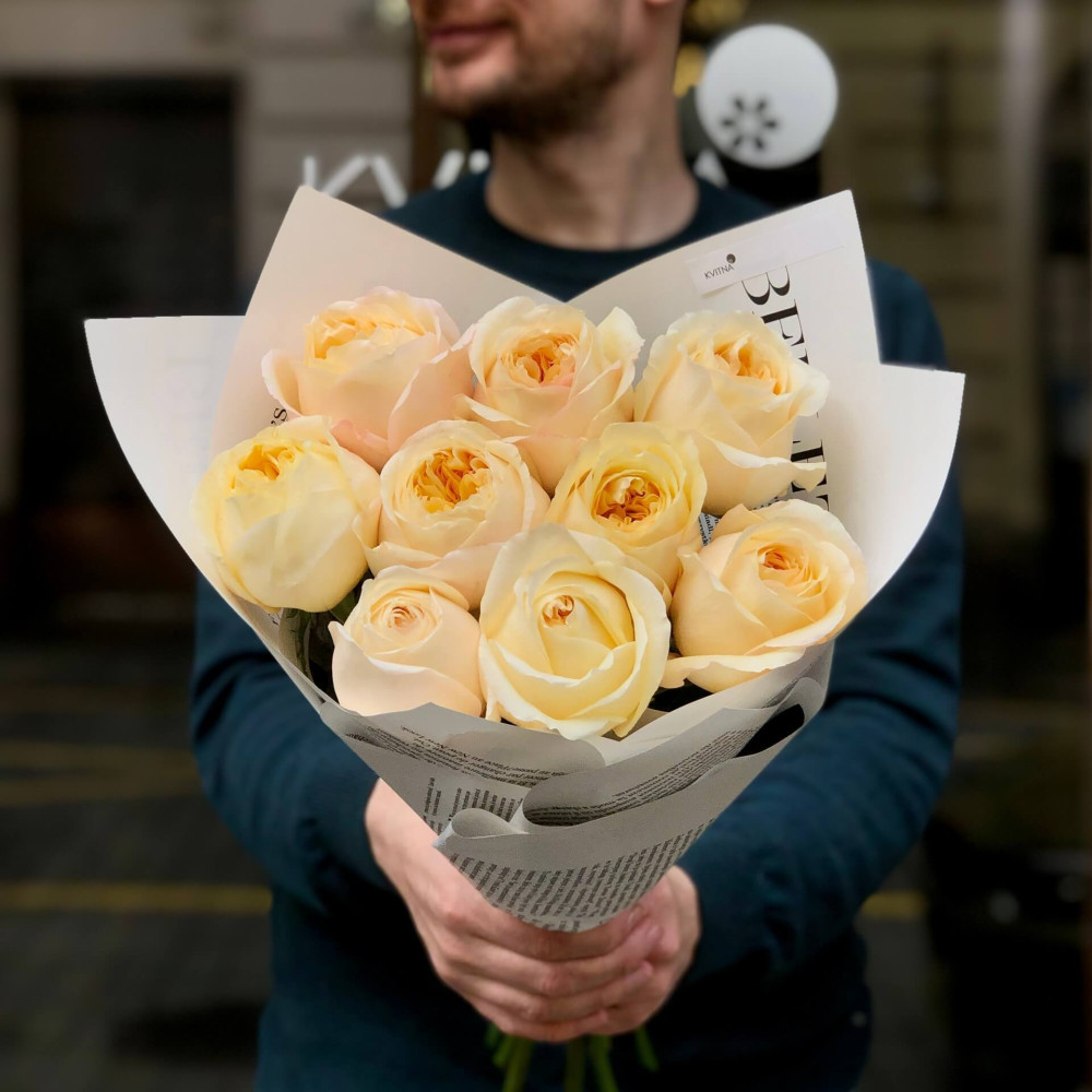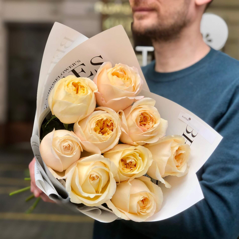 - Як замовити 9 півонієвидних троянд Cream X-Pression у букеті «Абрикосовий мармелад»? ❯