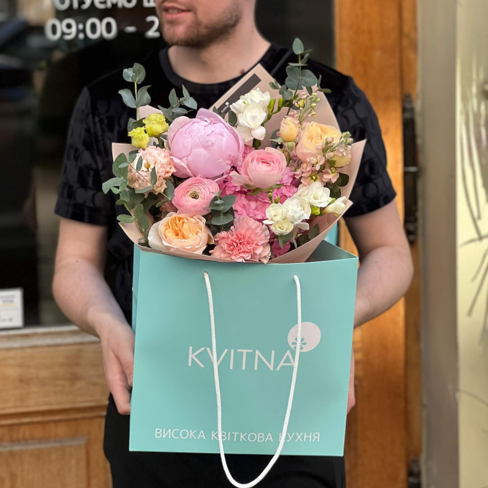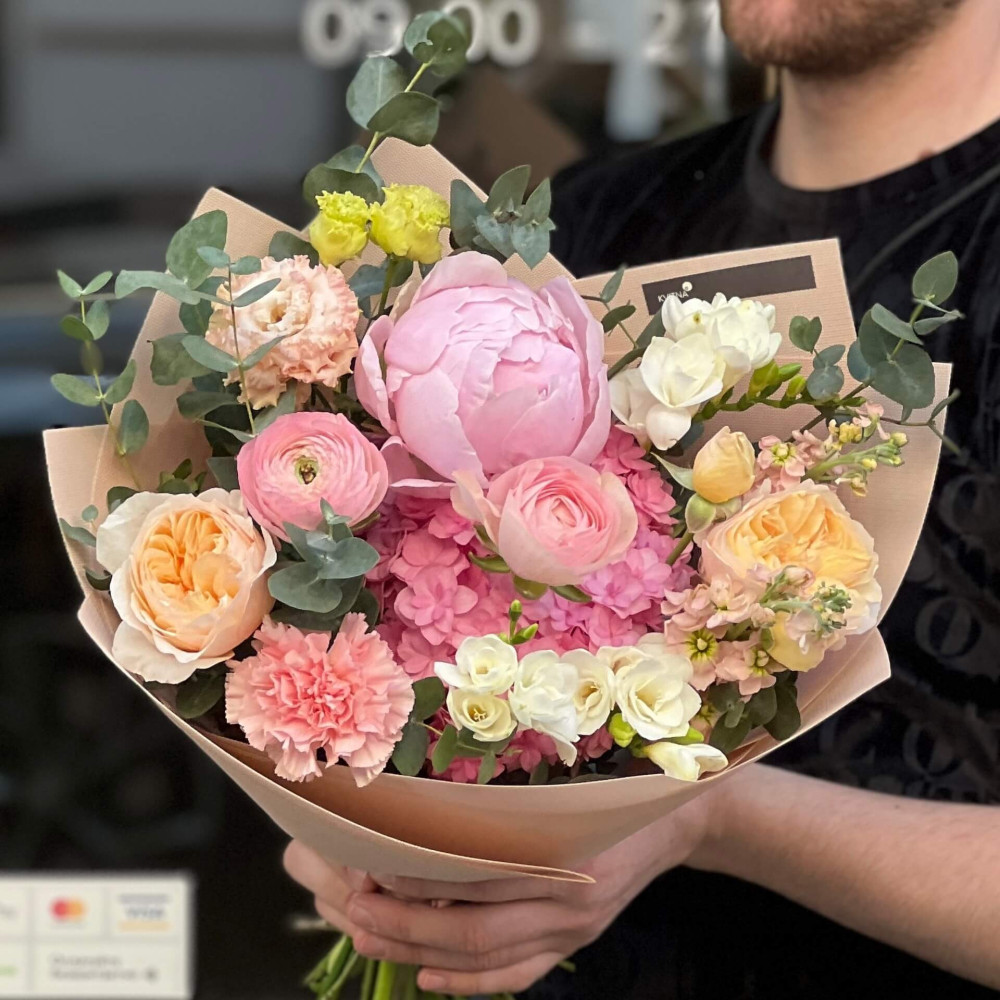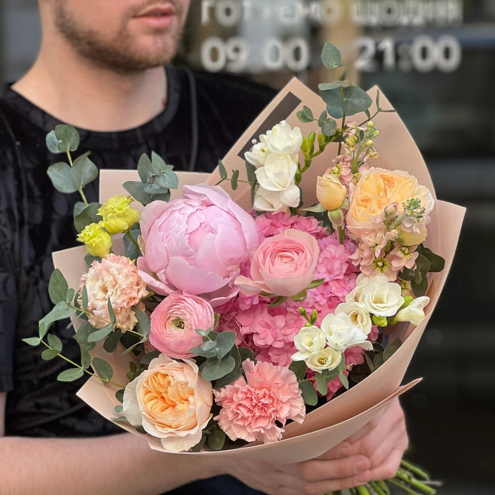 Квіти: Гортензія, Матіола, Евкаліпт, Фрезія, Діантус (Гвоздика), Ранункулюс, Еустома, Троянда піоновидна, Півонія
