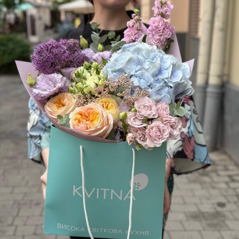 Квіти: Озотамнус, Матіола, Троянда кущова, Троянда піоновидна, Еустома, Евкаліпт, Гортензія, Алліум