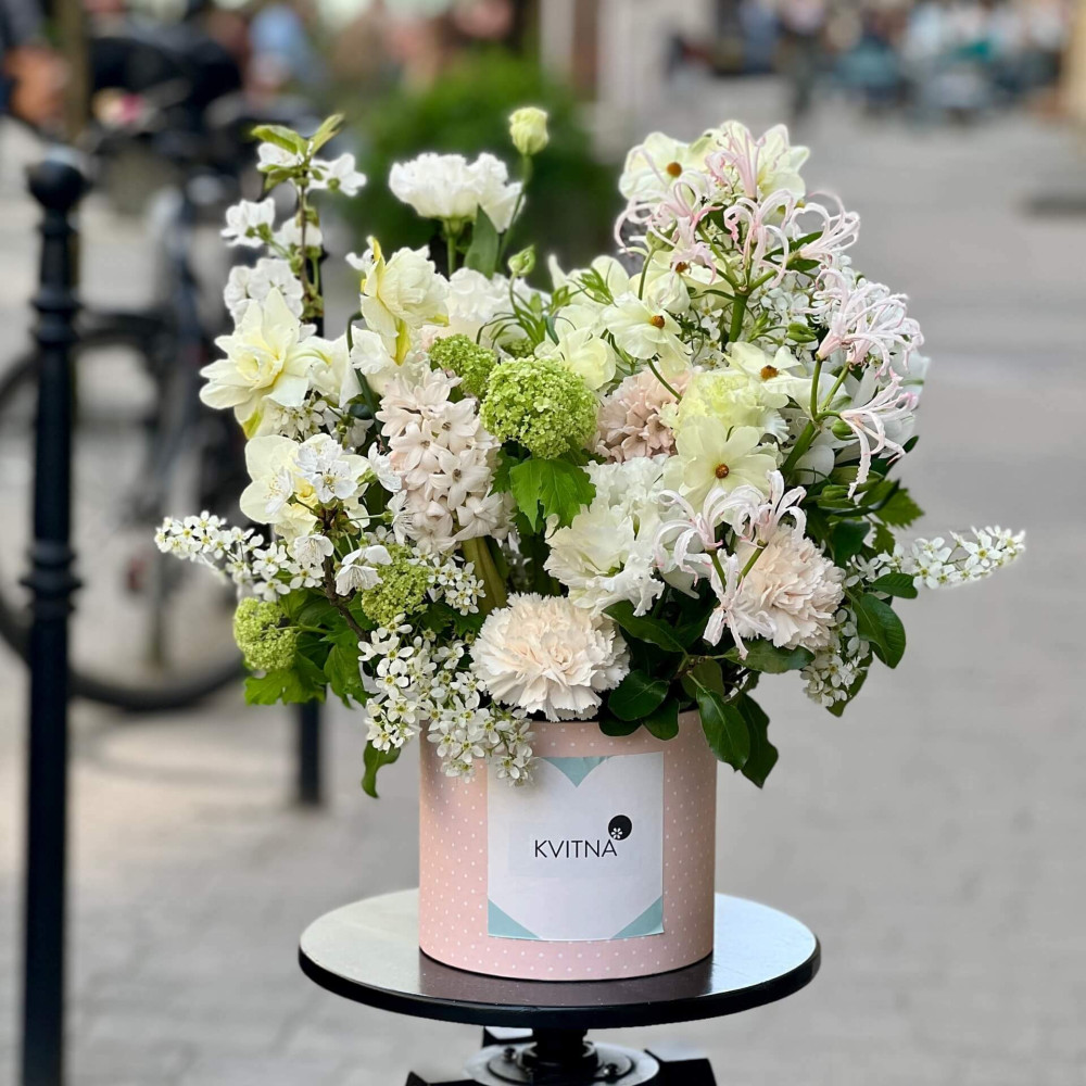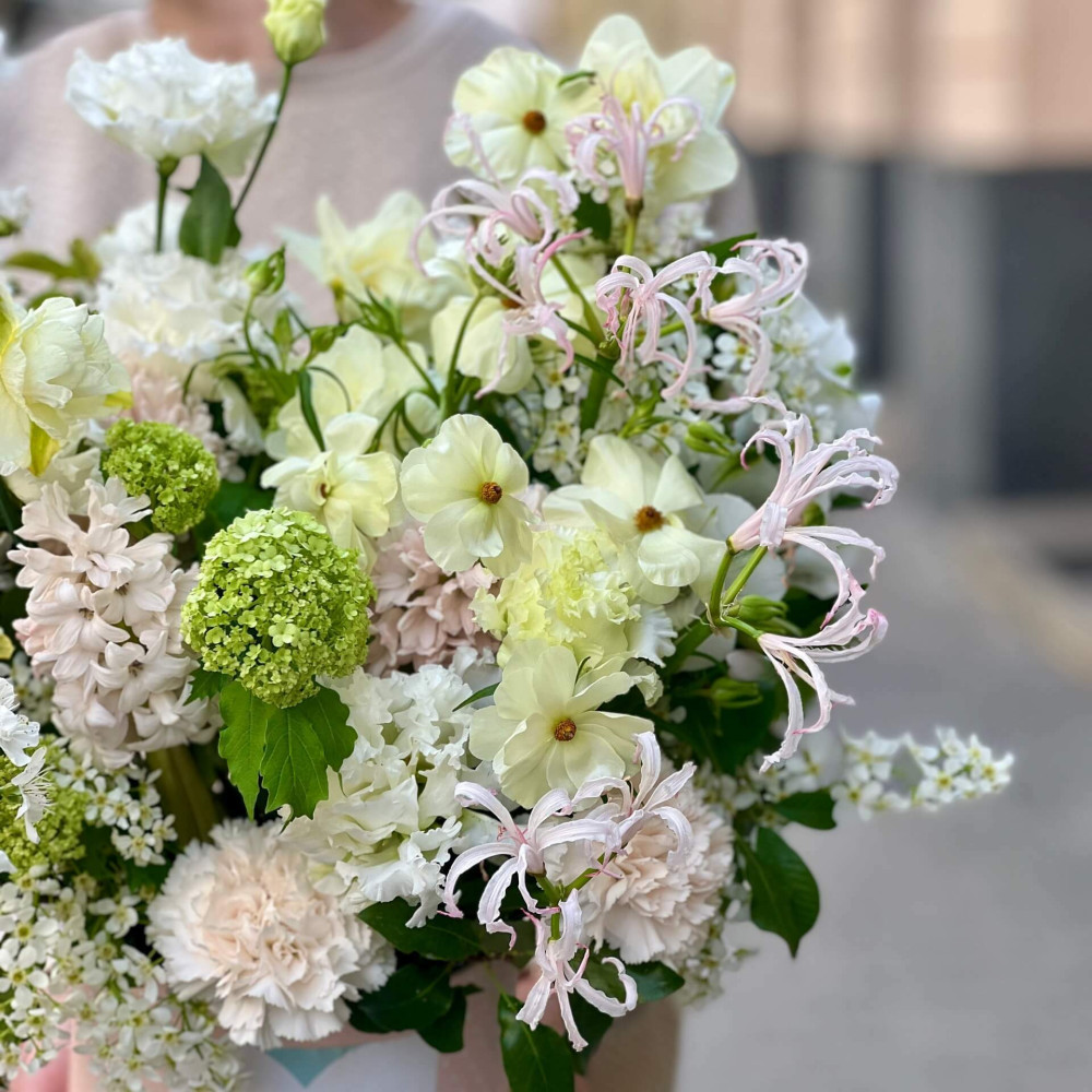 Квіти: Ранункулюс, Гіацинт, Еустома, Піттоспорум, Діантус (Гвоздика), Неріне, Вібурнум, Нарцис, Цвіт вишні