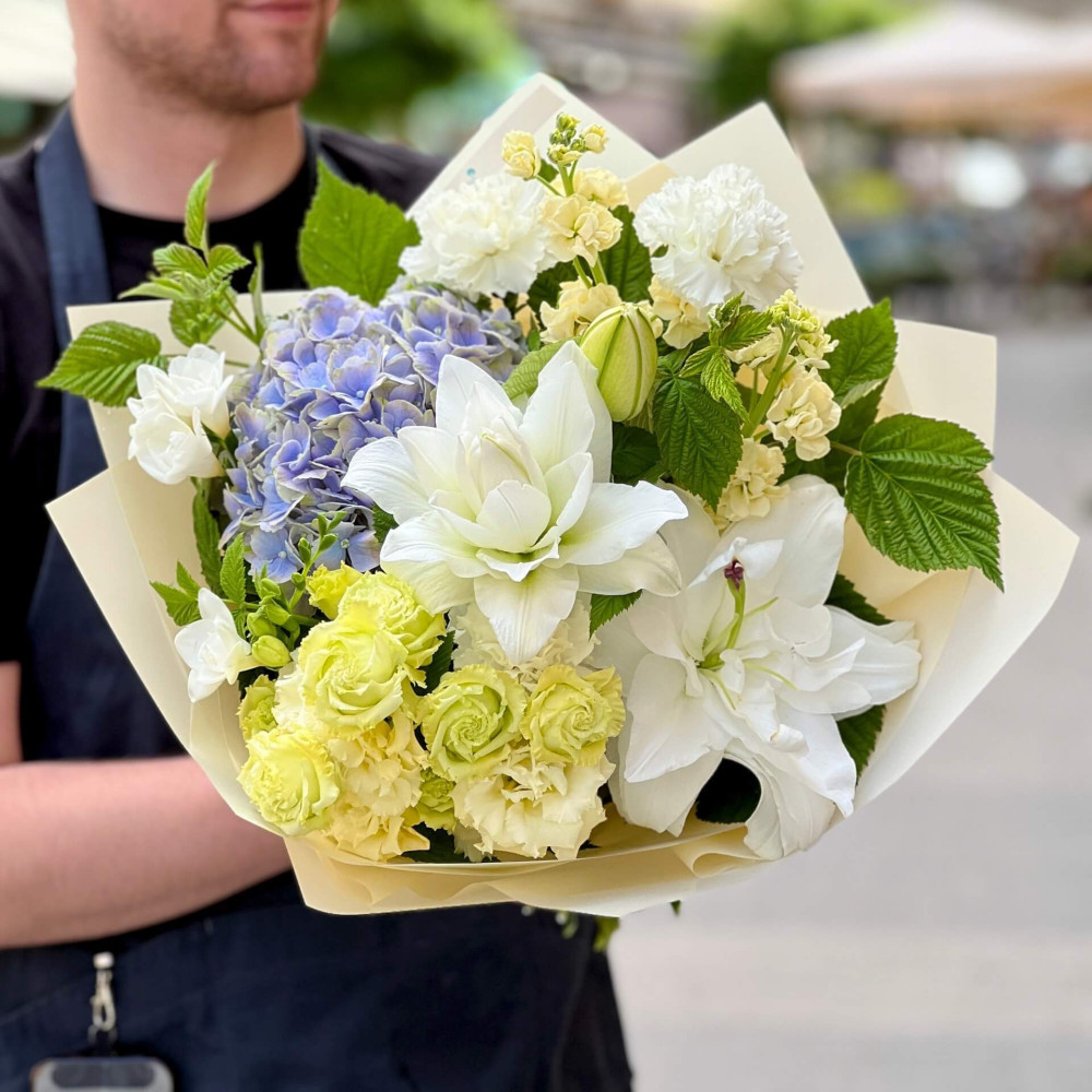 Квіти: Гортензія, Діантус (Гвоздика), Еустома, Фрезія, Лілія, Матіола, Малина (листя)