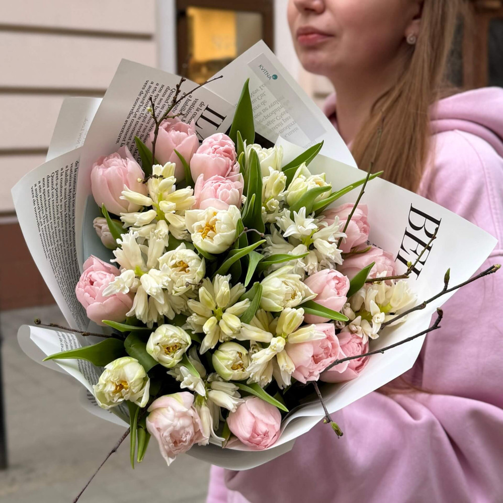 Ароматний весняний букет із півонієвидних тюльпанів та гіацинтів «Співочі пташечки»