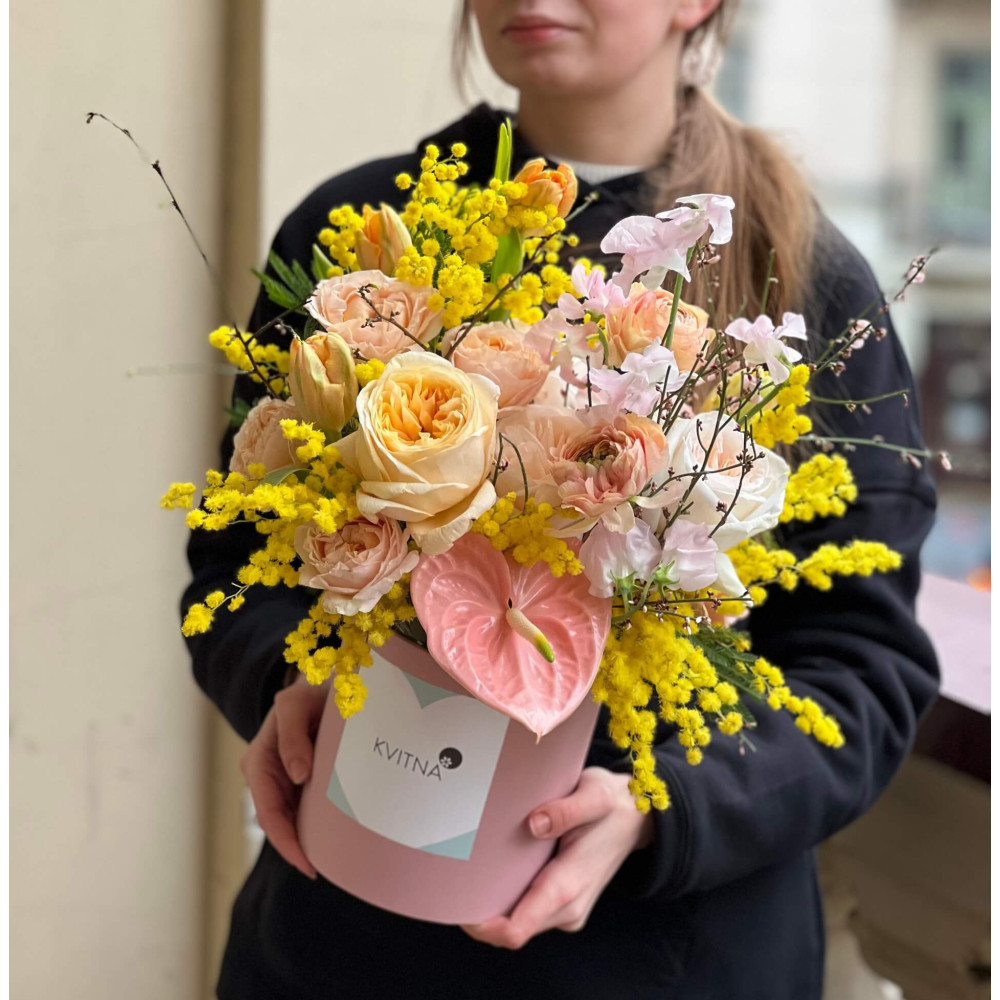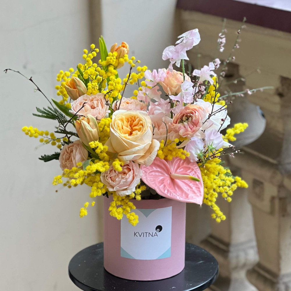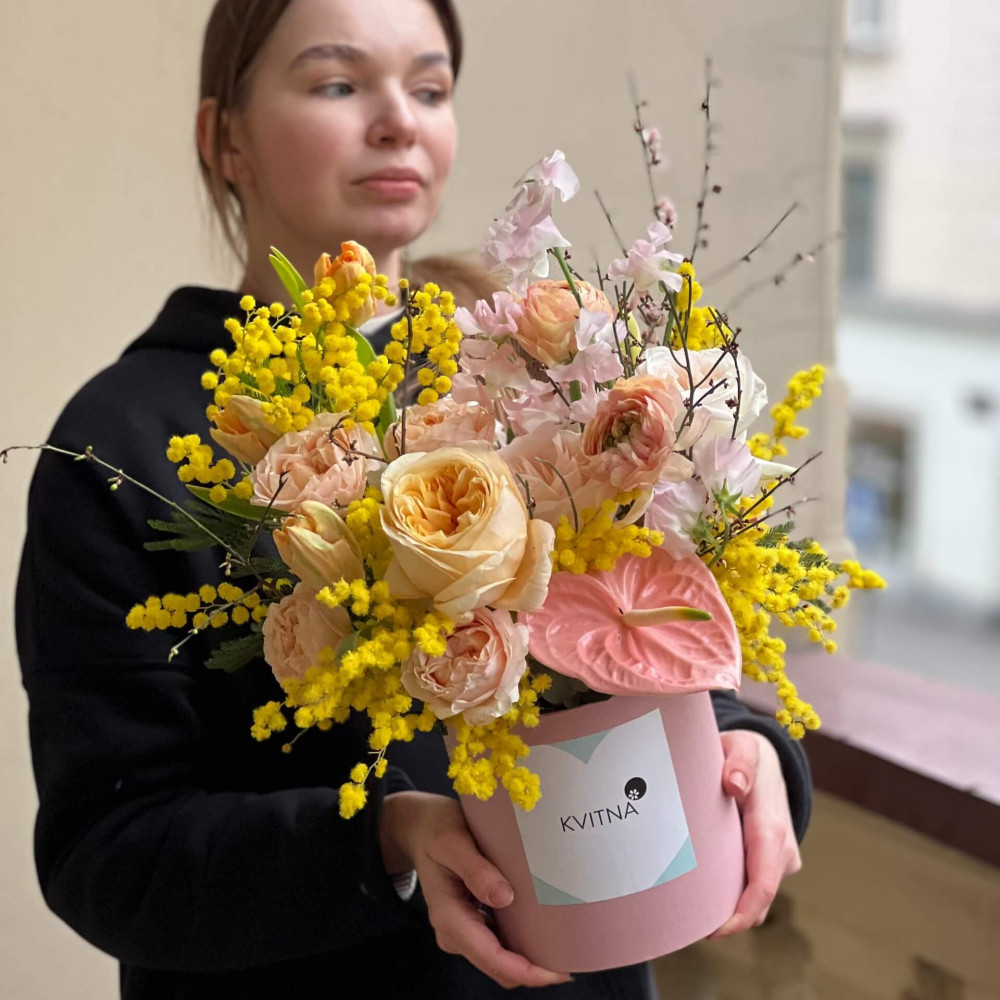 Нехай композиція (коробка, кошик, сніп) з квітами від Квітна тішить Вас якнайдовше!