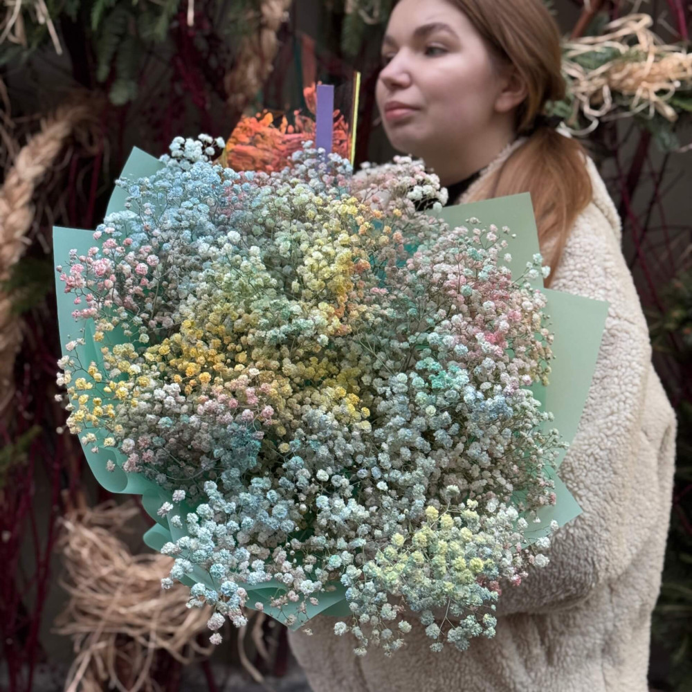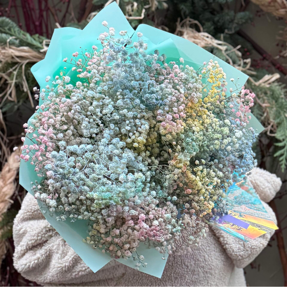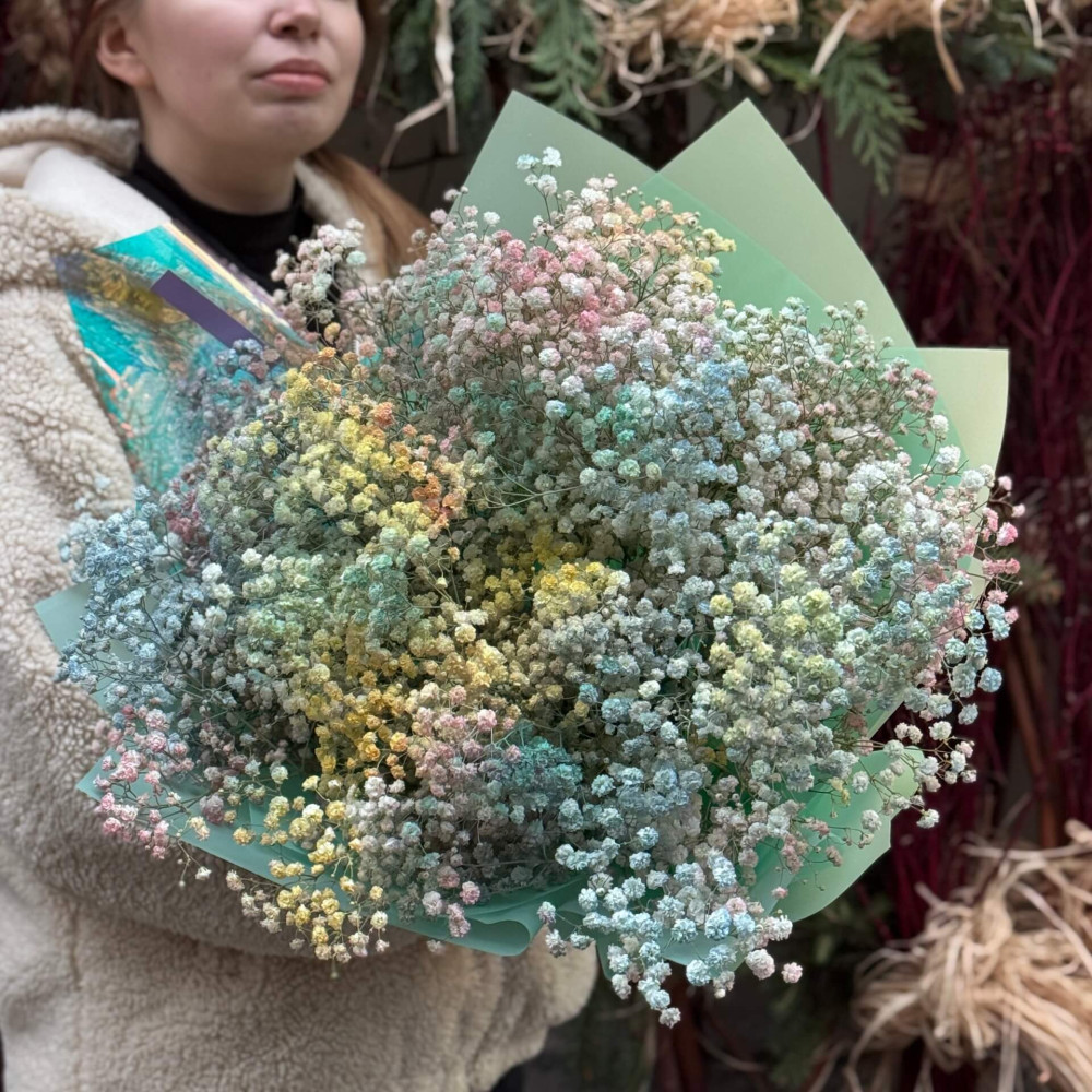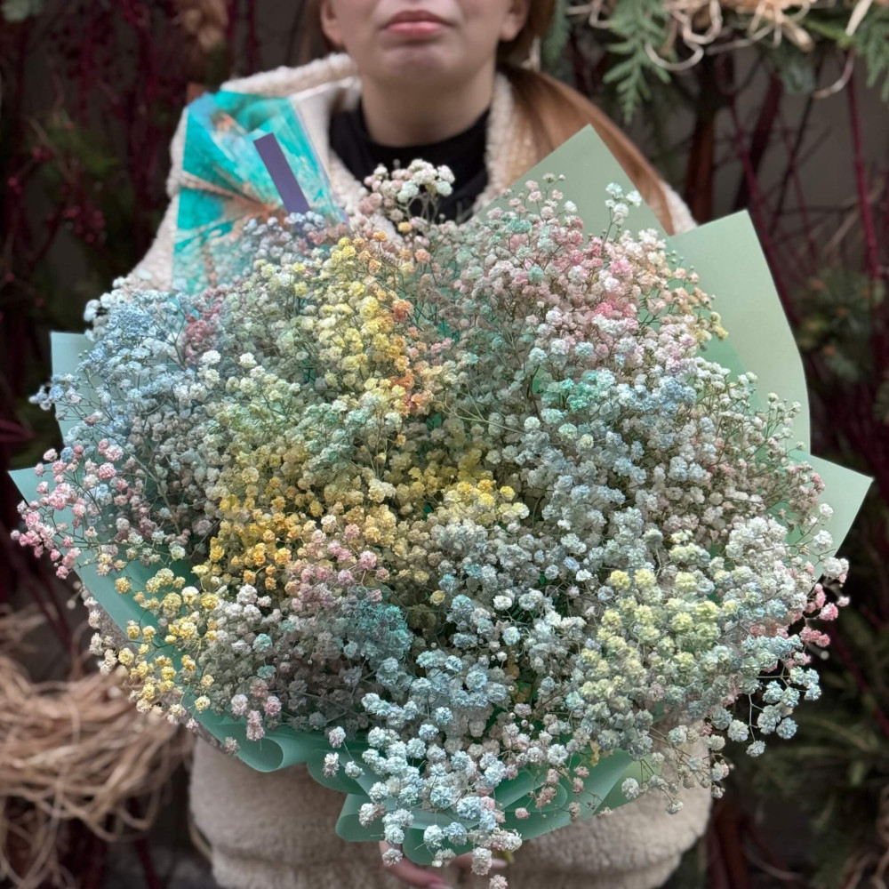 - Як замовити Барвистий букет з 19 гілок гіпсофіли «Кольоровий дим»? ❯