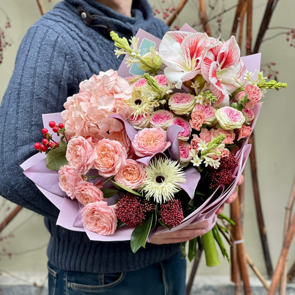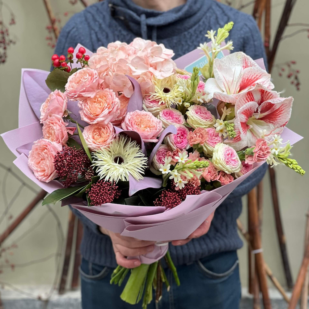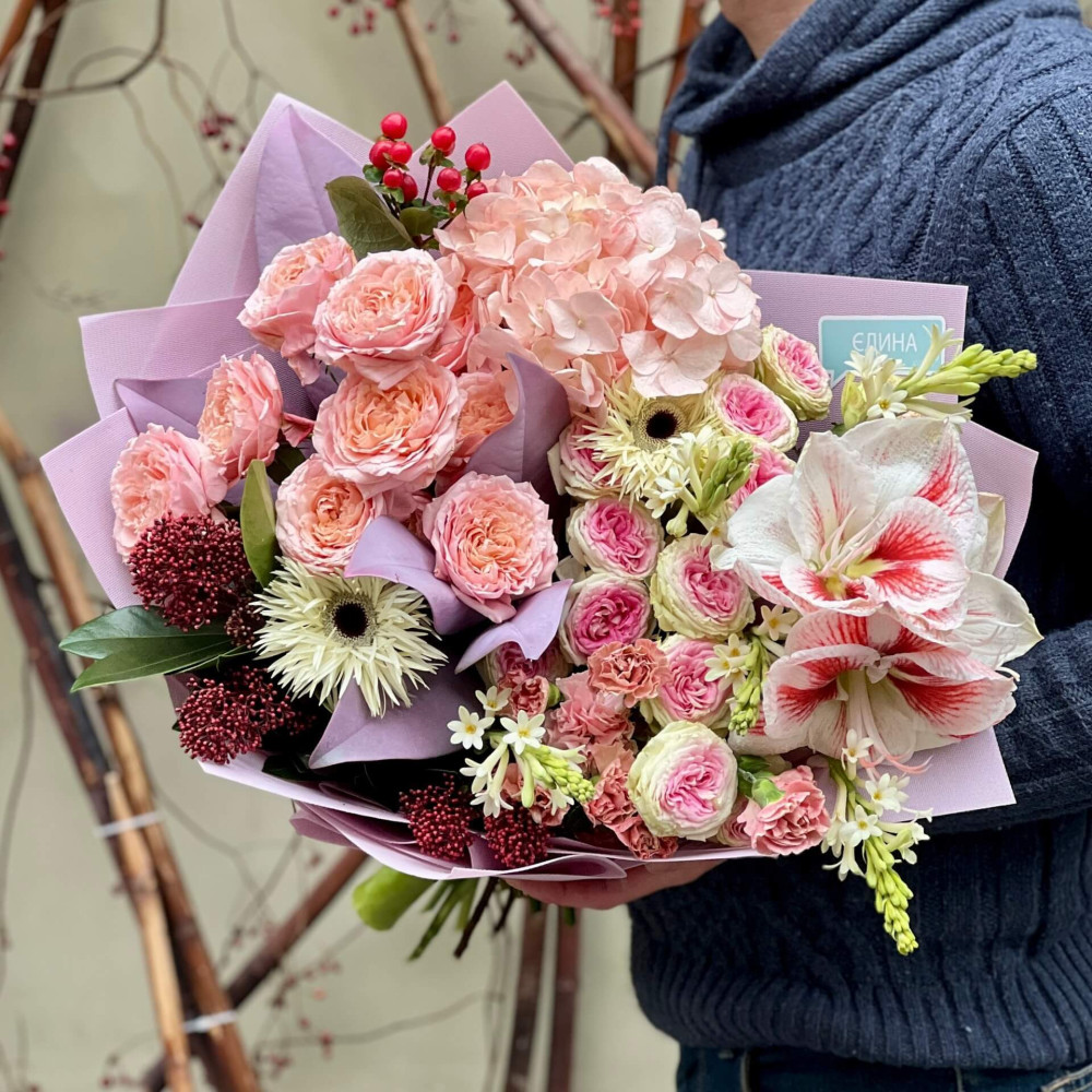- Як замовити Барвистий букет з амарилісом та кущовою піоновидною трояндою «Цікава мозаїка»? ❯