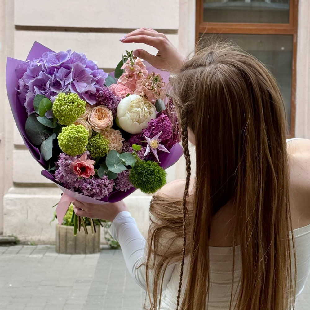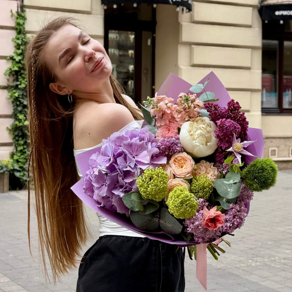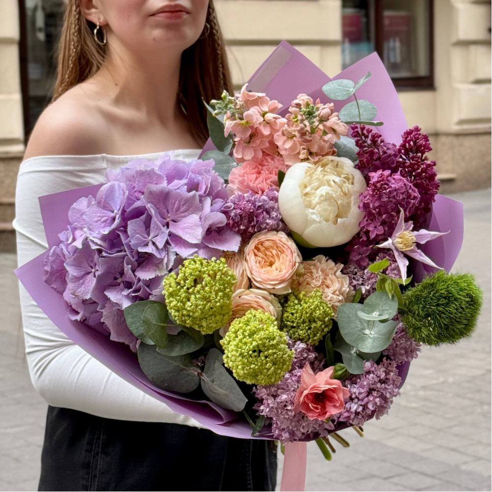 - Як замовити Барвистий пухкий букет з гортензією та бузком «Твоя любов»? ❯