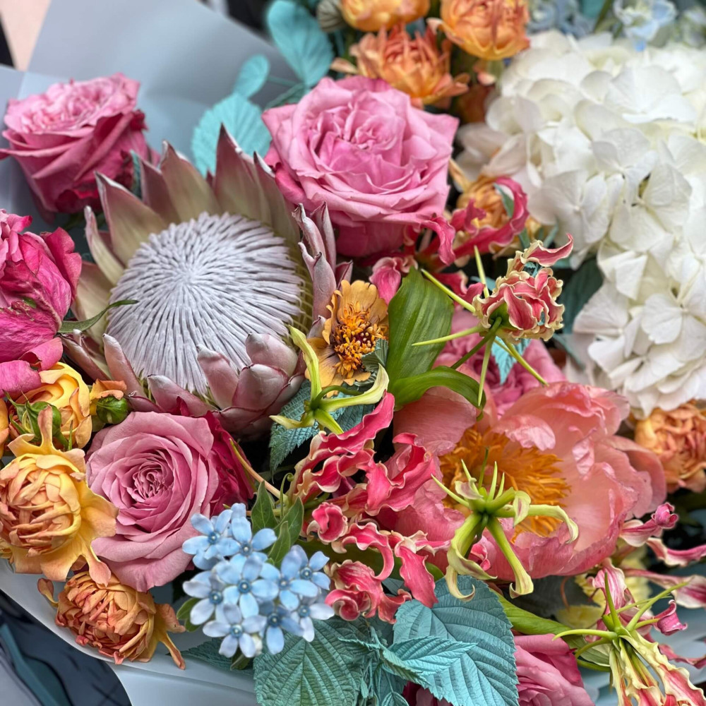 Квіти: Малина (листя), Оксіпеталум, Антиррінум, Троянда піоновидна кущова, Діантус (Гвоздика), Дельфініум, Троянда піоновидна, Протея, Гортензія, Глоріоза