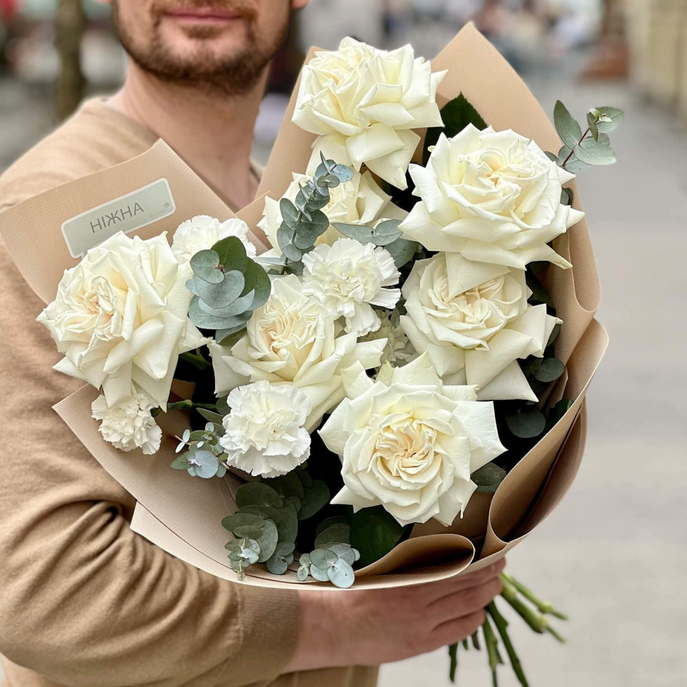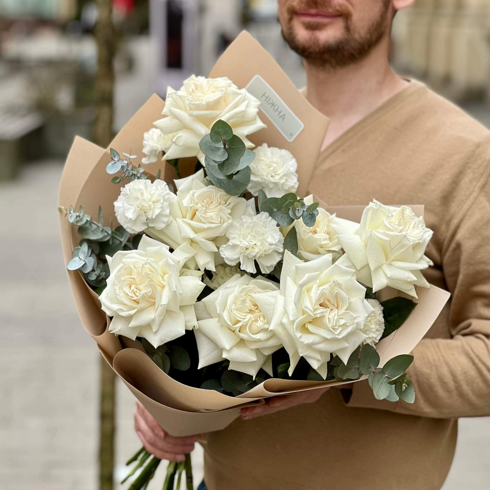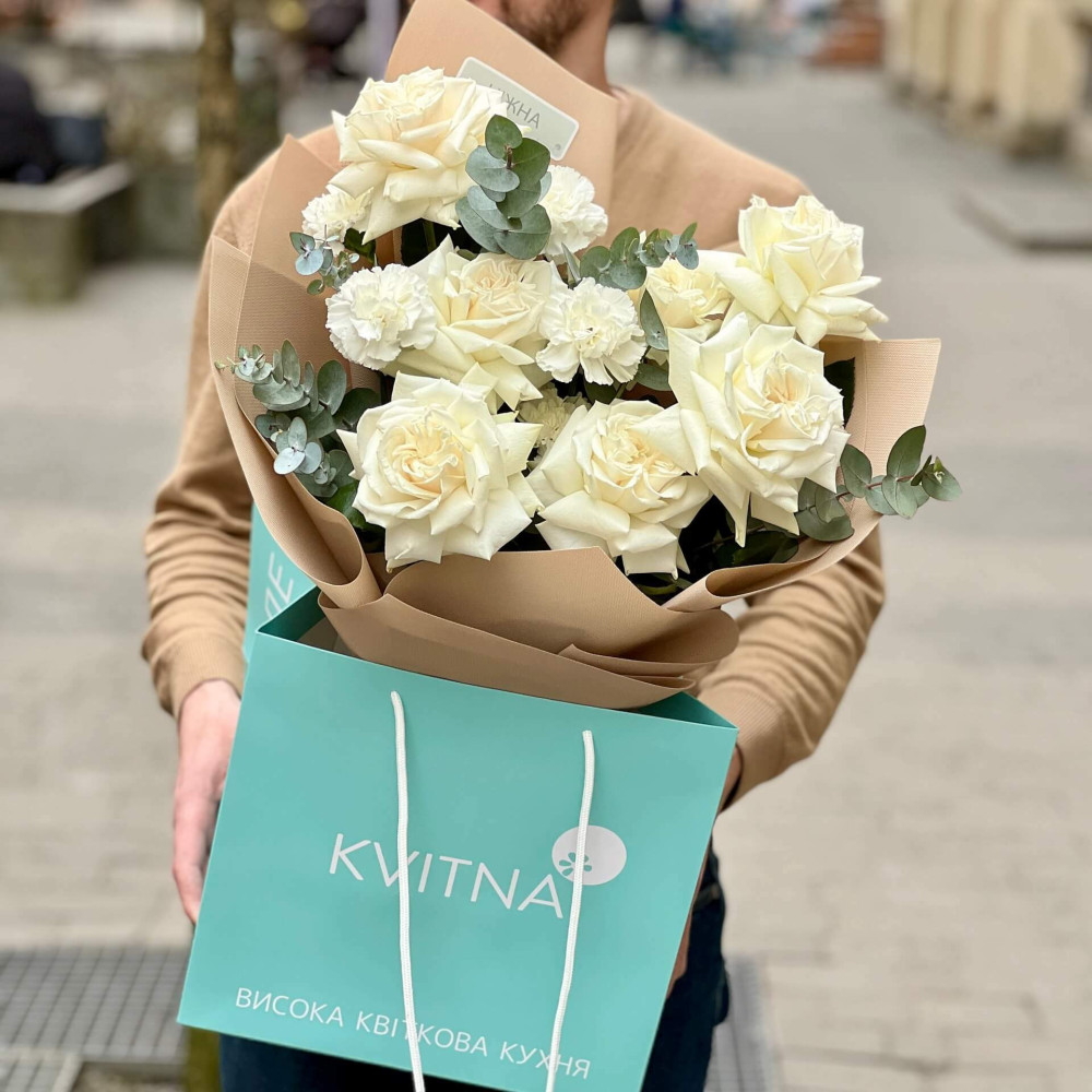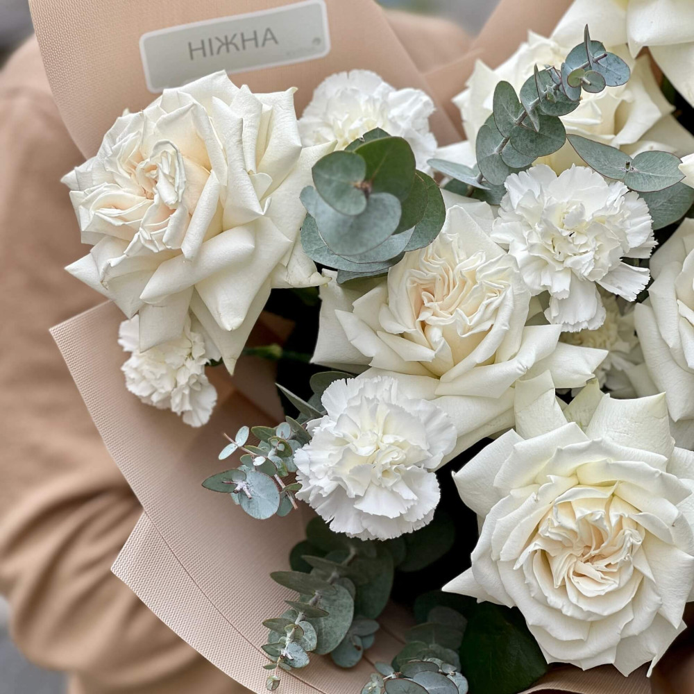 - Як замовити Білий букет із троянд Playa Blanca та діантусів «Світлий вальс»? ❯