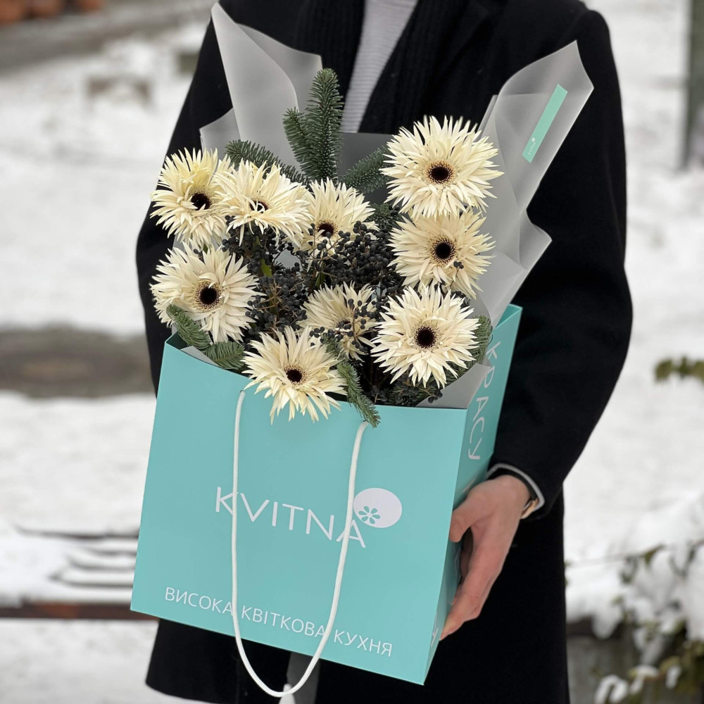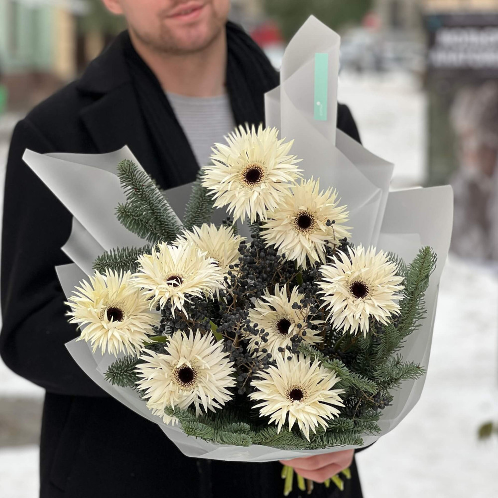 Великі мереживні сніжинки гербери прикрашають мене, а срібляста хвоя нобілісу захищає їх від вітру. Візьми собі лісову казку додому!