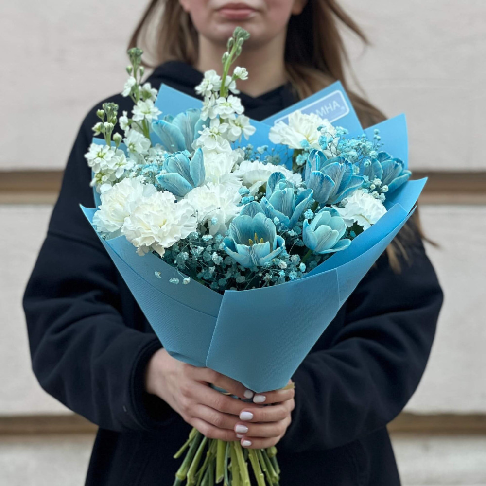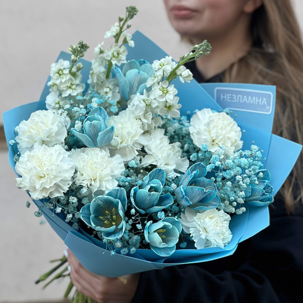 - Як замовити Біло-блакитний букет «Мерехтіння небес»? ❯
