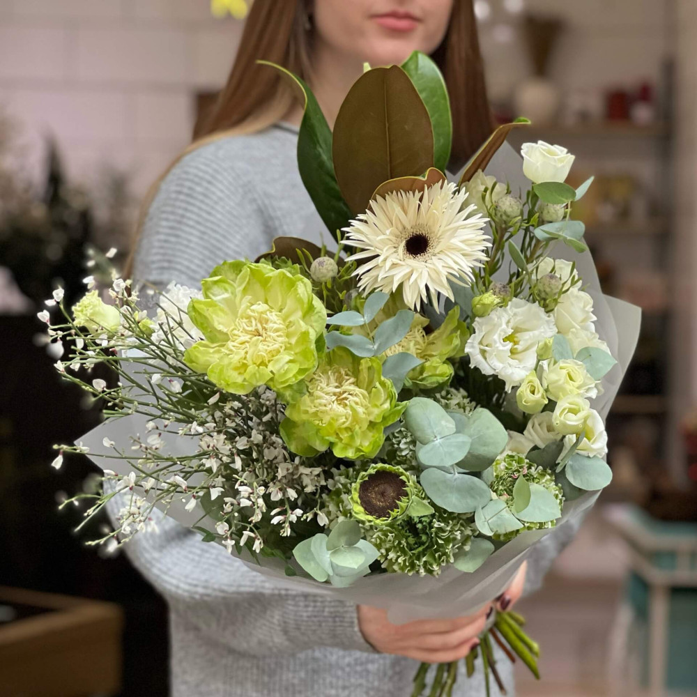 - Як замовити Біло-зелений букет із цікавими трояндами та ранункулюсами та ніжною еустомою «Зелені хвильки»? ❯