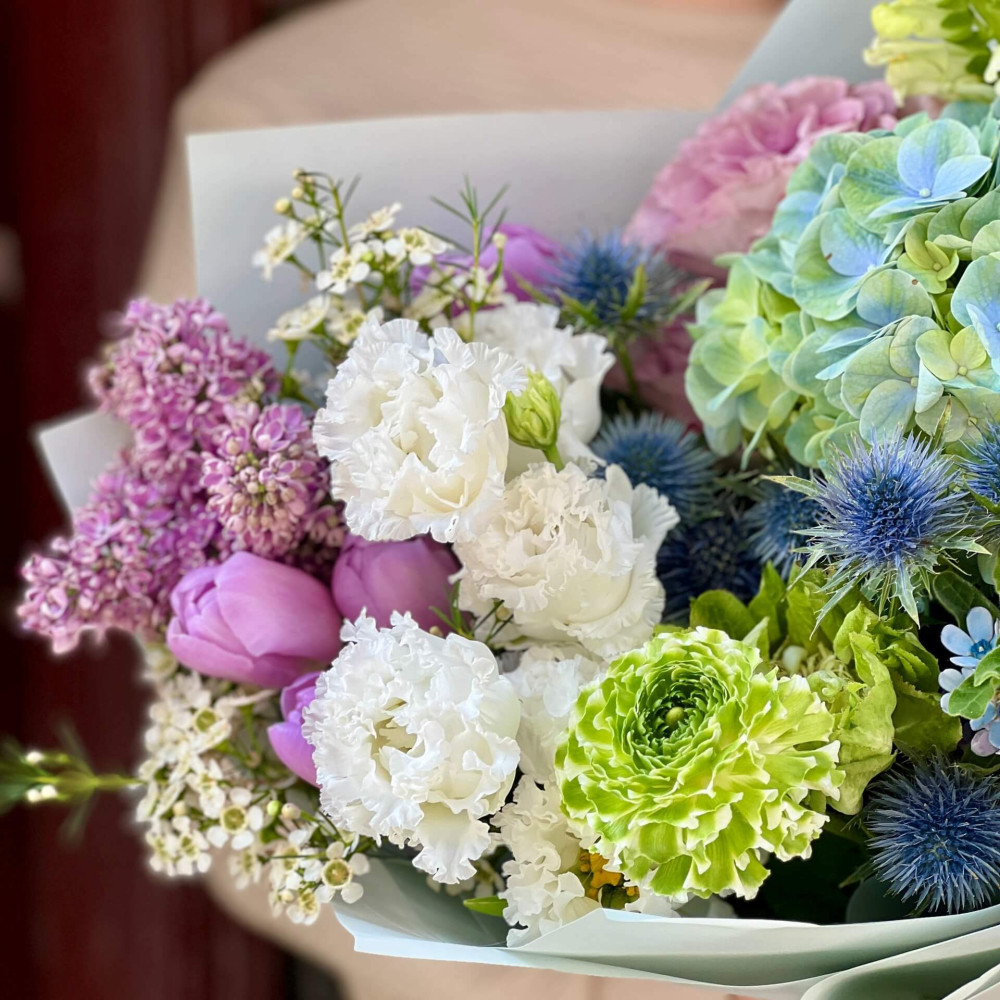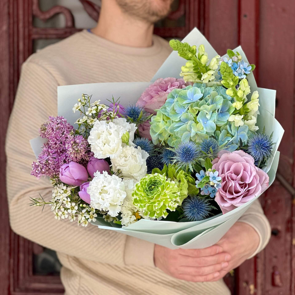 Блакитні квіти - гортензія, оксипеталум, ерингіум - це немов водяне плесо, в якому відбивається весняне небо, коли ще на березі дотає останній сніг білої еустоми, але вже зацвітають перші весняні квіти, серед яких фіалкові тюльпани, бузок та троянда.
