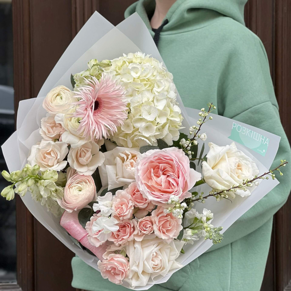 Квіти: Гортензія, Троянда піоновидна, Гербера, Троянда кущова, Ранункулюс, Матіола, Дельфініум, Антуріум