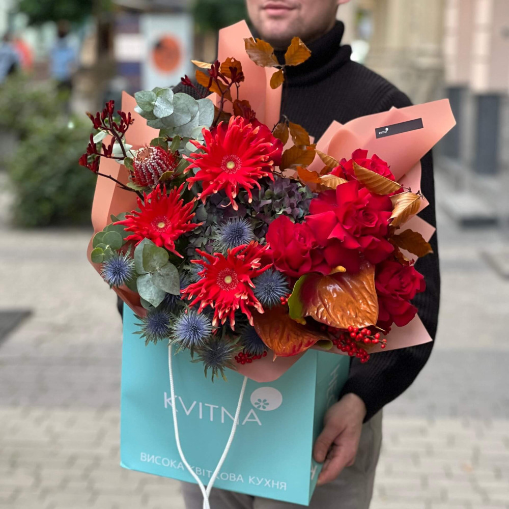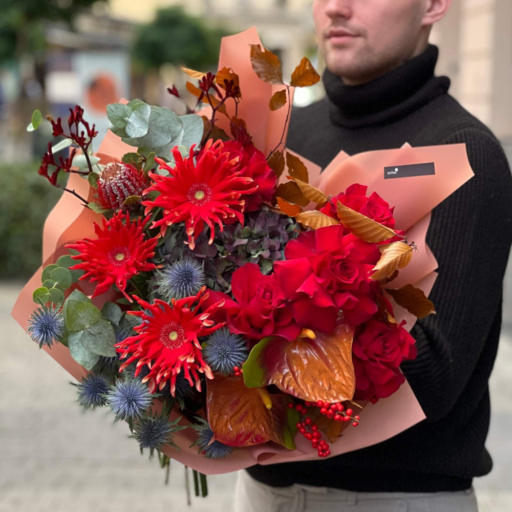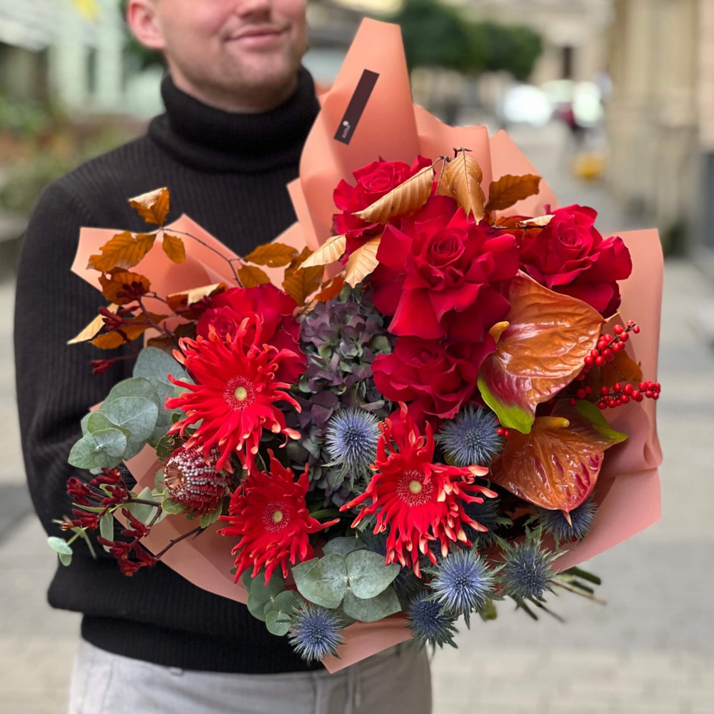 Дуже осінній і дуже яскравий букет, який подарує тобі приємні емоції. Завдяки цікавому складу його хочеться поставити десь біля себе і милуватися ним постійно.