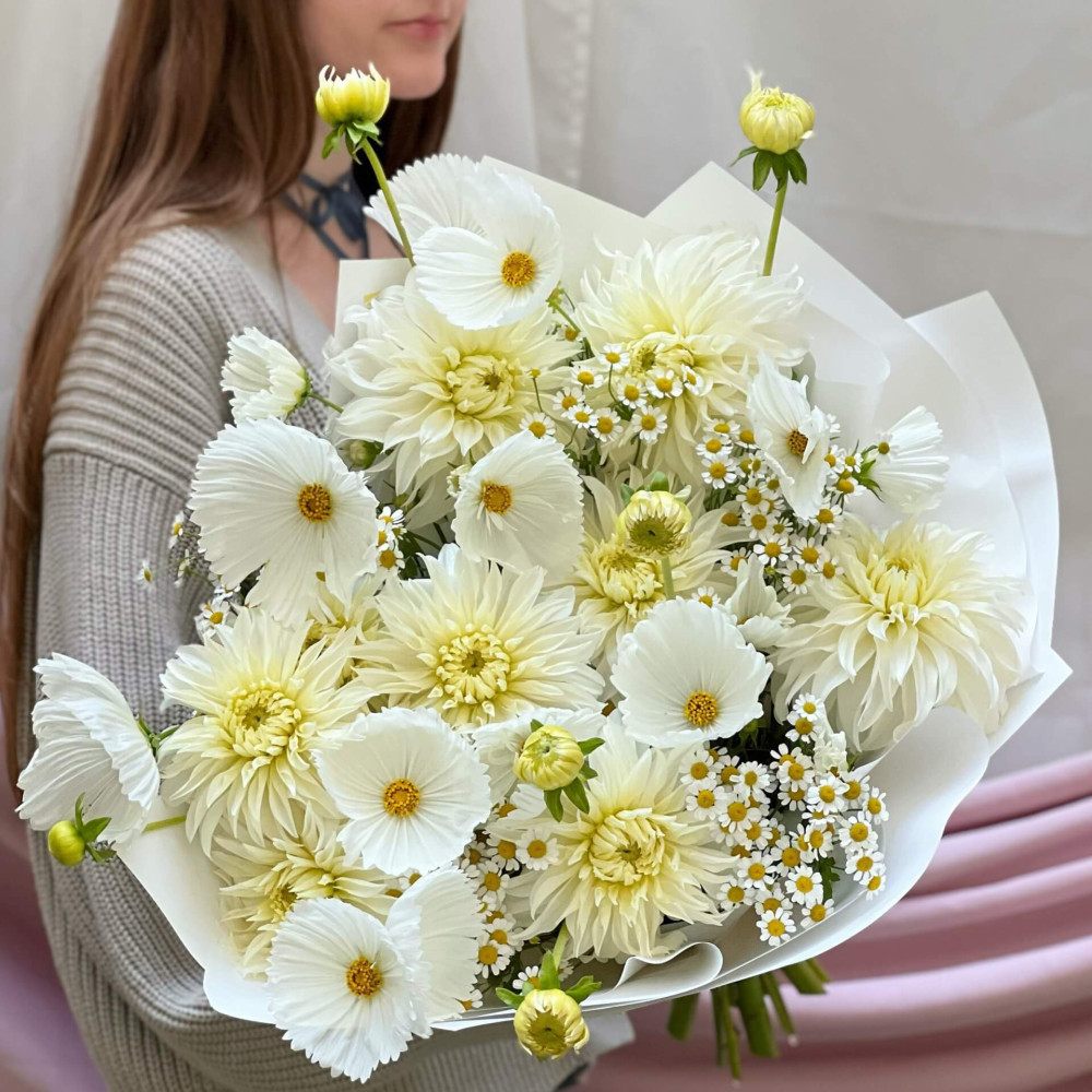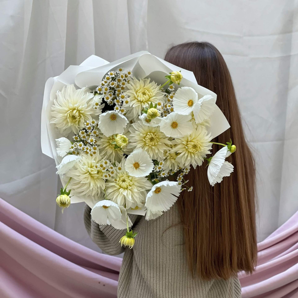 Світла легка композиція з сезонних квітів немов Молочний шлях – тисячі білих зірок мерехтять в вічному сяйві туманності. Створений, аби подарувати відчуття легкості та світла.