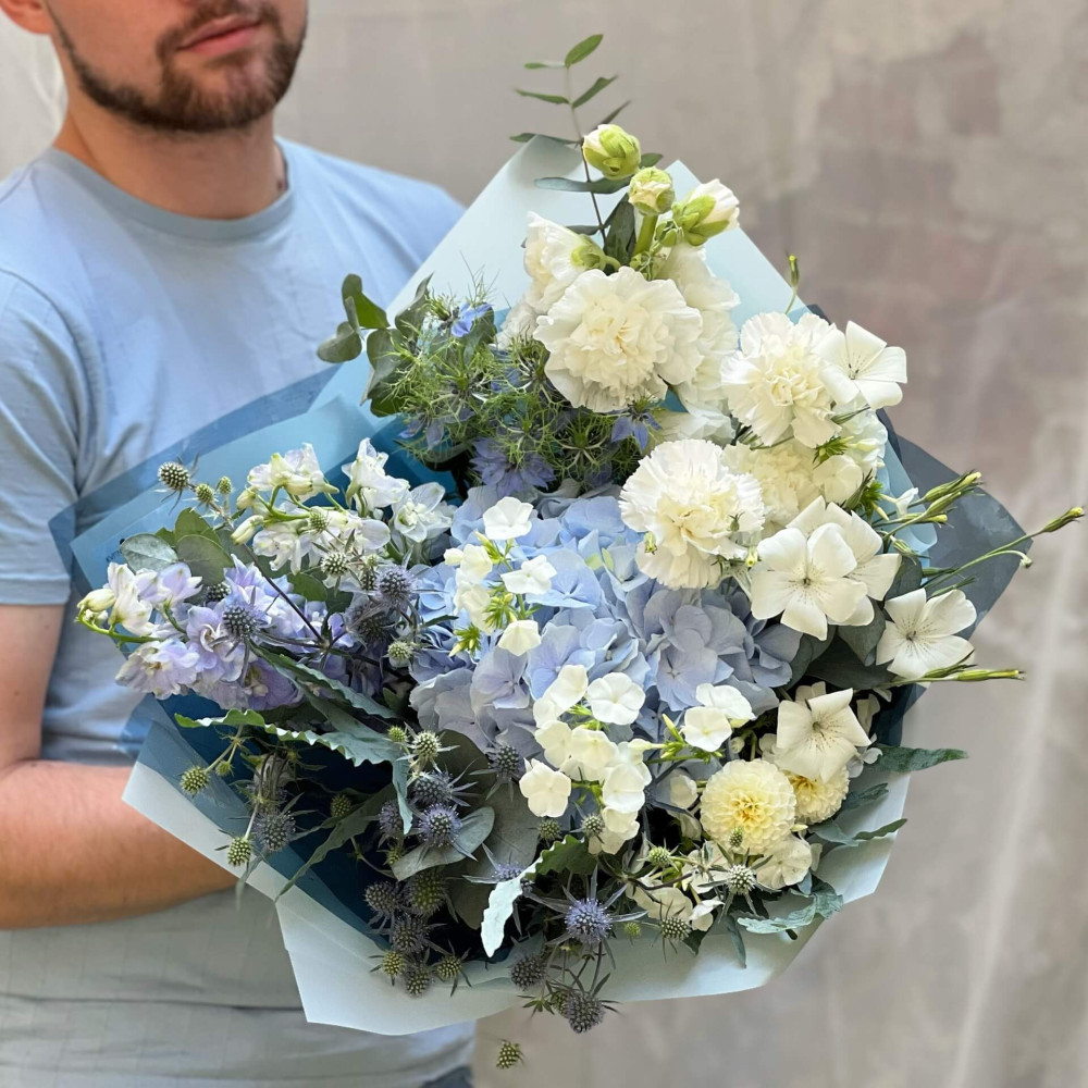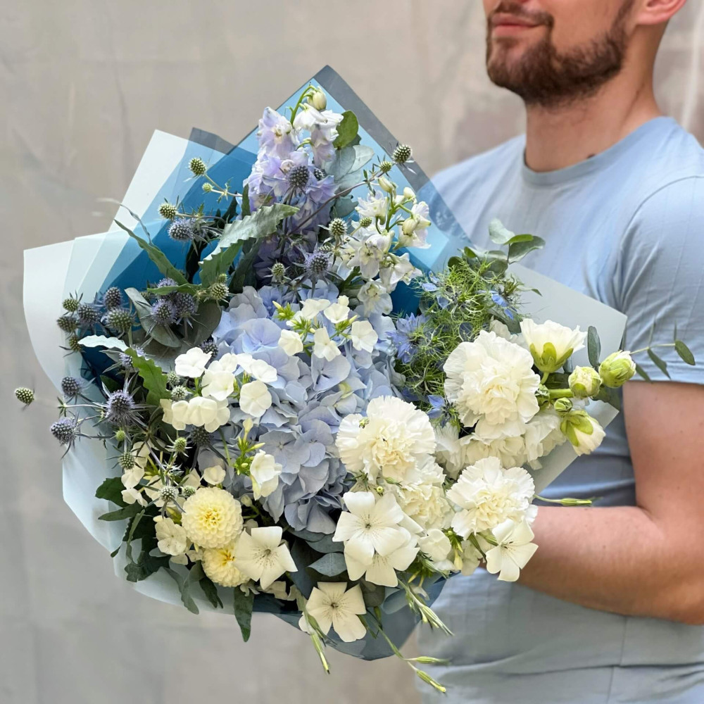 Там де сині гори підступають до сапфірового моря, ошатні будиночки мають сині дахи, а блакитні гортензії обрамляють алеї саду королівського палацу, гарний теплий клімат, прохолода тінистих алей і блакитний колір цього букета - символ вірності і гармонії з собою.