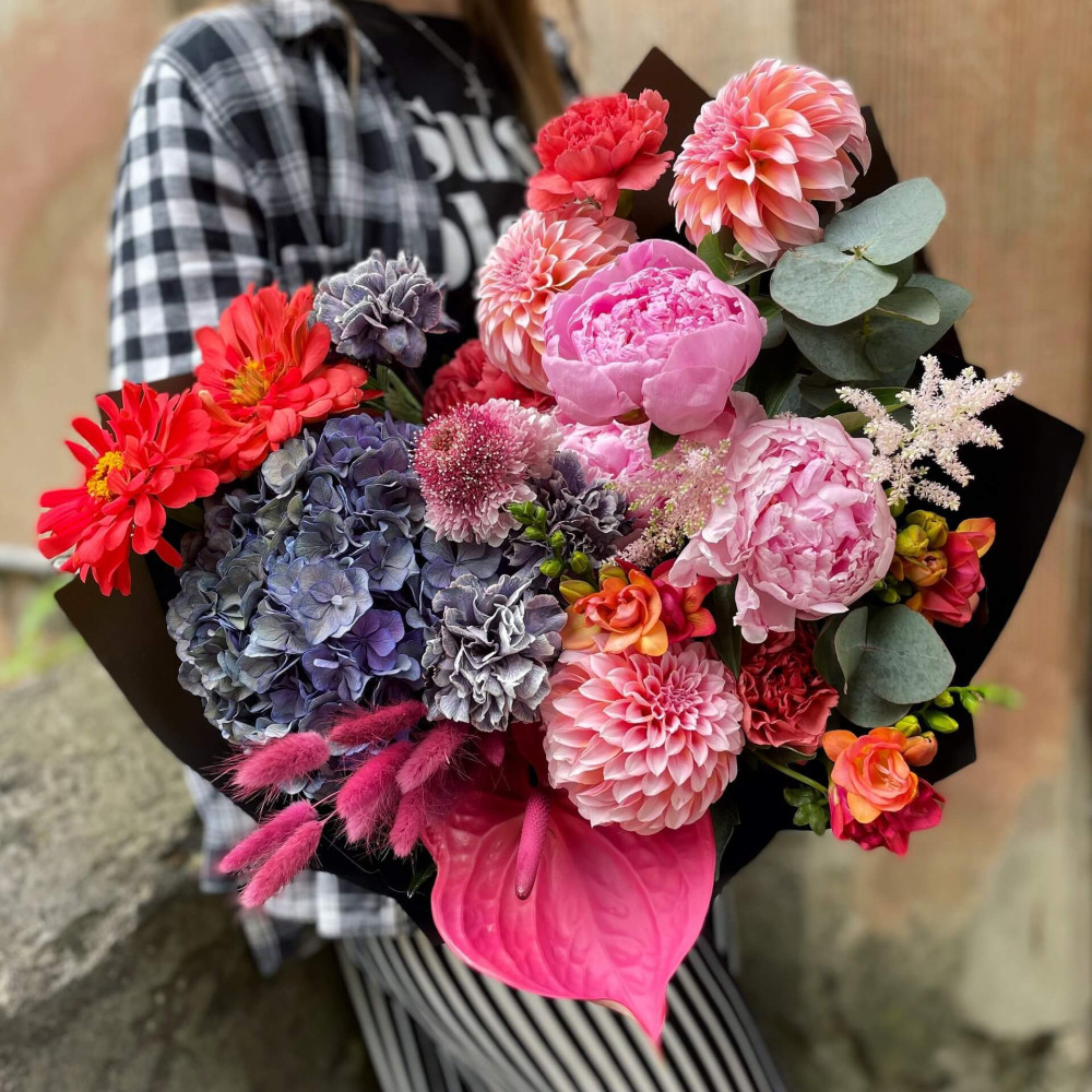 Квіти: Жоржина, Цинія, Півонія, Антуріум, Астільба, Фрезія, Скабіоза, Лагурус, Евкаліпт, Діантус, Гортензія